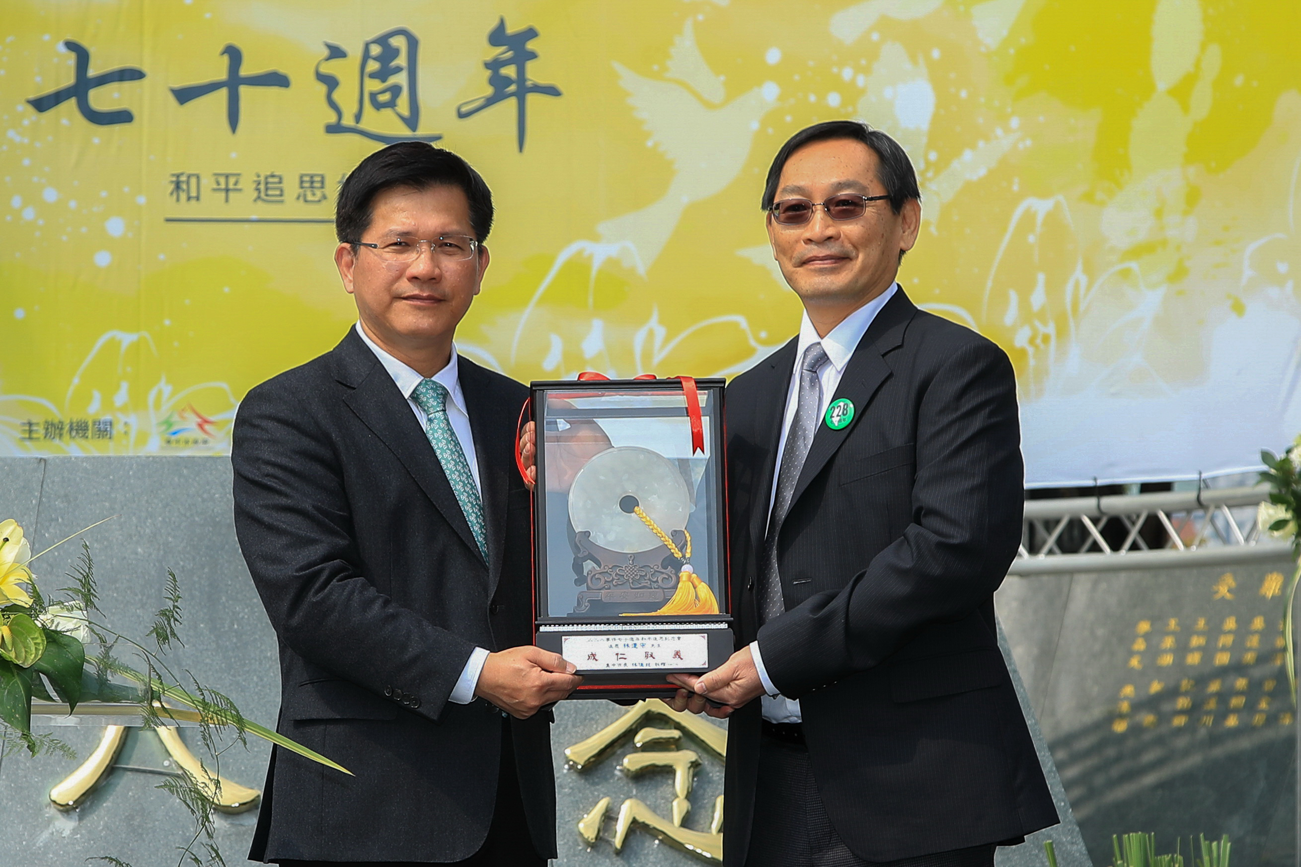 時值228 70周年,紀念會上特別邀請在228事件中,為台灣人發聲的參議員林連宗的外孫廖英豪與會,代表接受市長頒贈刻有「成仁取義」的獎座。