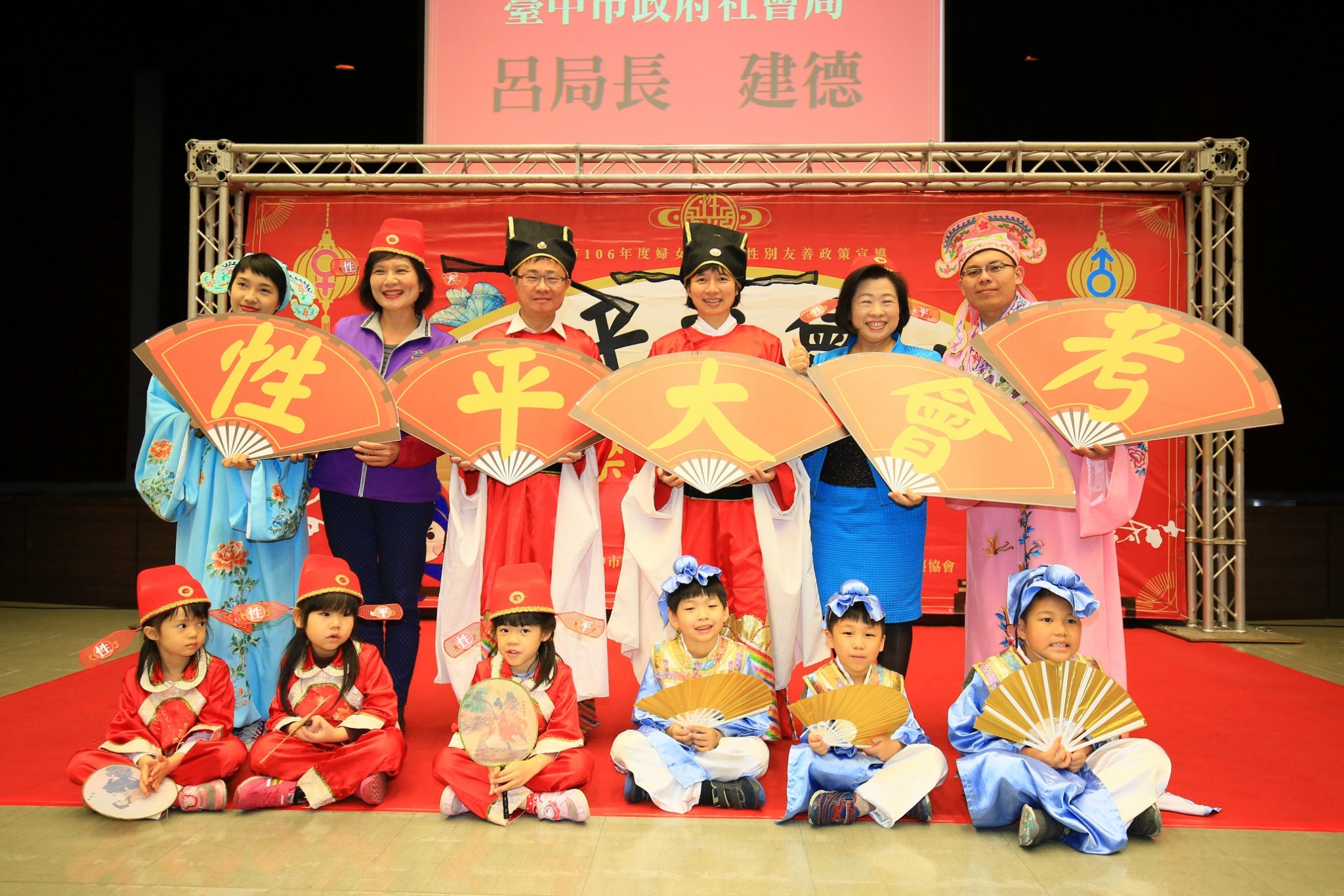 市府社會局今(1)日在台灣大道市政大樓舉辦記者會,活動在精采的川劇變臉、〈梁祝〉穿越劇中熱鬧展開,副市長林依瑩、社會局長呂建德穿上紅色狀元袍,頭戴狀元帽,與幼兒園的小小秀才們,熱情邀請全國民眾赴「台中趕考」,實踐性別平等。