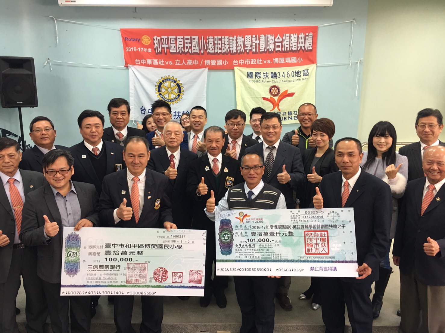 透過遠距課輔教學計畫,台中市政扶輪社、台中東區扶輪社共同捐贈和平區博愛國小及博屋瑪國小各10萬元經費,為孩童增購電腦硬體設備,並透過立人高中安排規劃外語優異的學生,共同協助遠距課輔和平區博愛國小,讓師資缺乏的山區能克服路程遙遠及師資不易的問題,使學生可以更多元學習,此外,扶輪社也與偏鄉小校英語專長教師研發課程,提升教學與學習品質。