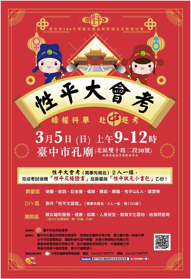 今年「性別大會考」首度仿古代科舉三段考制,包括筆試、口試及打卡按讚等,獲民眾熱烈響應,通過後可獲得書法大師親自書寫的性別及格證書,網路事先報名已額滿,但現場仍有許多表演、摸彩及闖關活動,更多資訊請至活動專頁(https://www.facebook.com/taichung.genderfriendly )查詢。