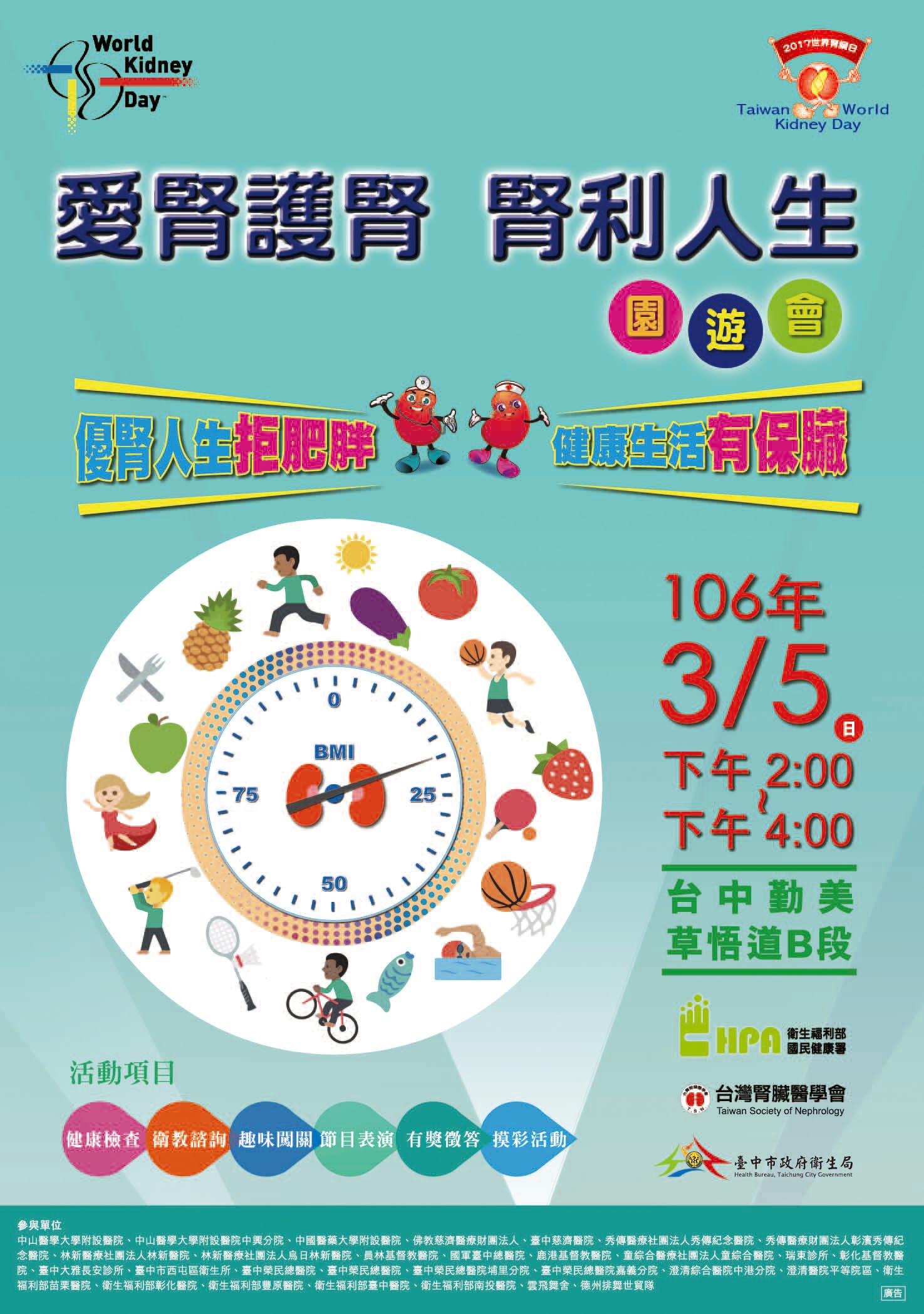 響應世界腎臟日於3月9日將到來,台灣腎臟醫學會結合台中市政府及中區醫療院所將於週日(5日)下午2點至4點,在草悟道共同舉辦「2017世界腎臟日園遊會」,安排一系列活動,透過寓教於樂方式呼籲大家重視身體健康,包括健康檢測、衛教諮詢、有獎徵答、摸彩及闖關遊戲等趣味節目,更提供腎臟保健知識及免費篩檢服務,歡迎共襄盛舉。