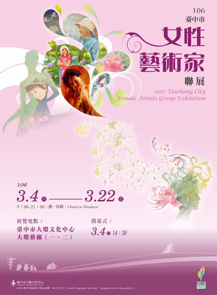 「106年度台中市女性藝術家聯展」自週六(4日)起在大墩文化中心展開,預計展至3月22日止,今年共徵集95位藝術家參與聯展,期盼展現更多「女性」能量,活動將於週六午後2點30分於大墩文化中心大廳舉辦開幕式!本週還有不少展覽、演講等活動,更多資訊,請見「中市週末活動看板0304_0305」。(3/3*6)*新聞局