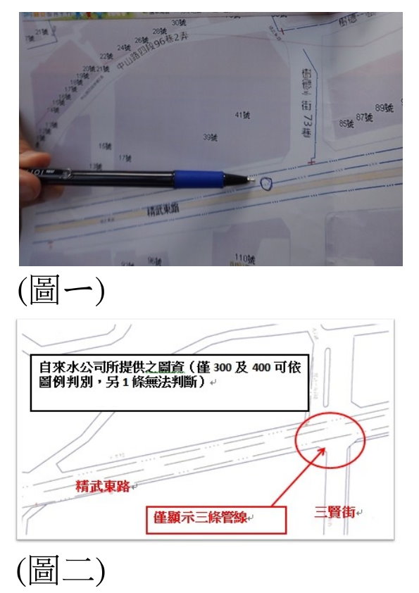 水利局強調,不論是自來水公司提供給該局的圖資,或自來水公司在蘋果日報上提供的圖資,圖面上僅顯示3條管線,兩份圖資均與現地實際管線不符,且提供給該局圖資沒有完整正確圖例及高程可供參考。且去年水利局辦理3次會勘,自來水公司與會代表均表示無意見,但實際現地卻發現4條自來水管線(除該3條管線外,另有1條1500MM管線)。