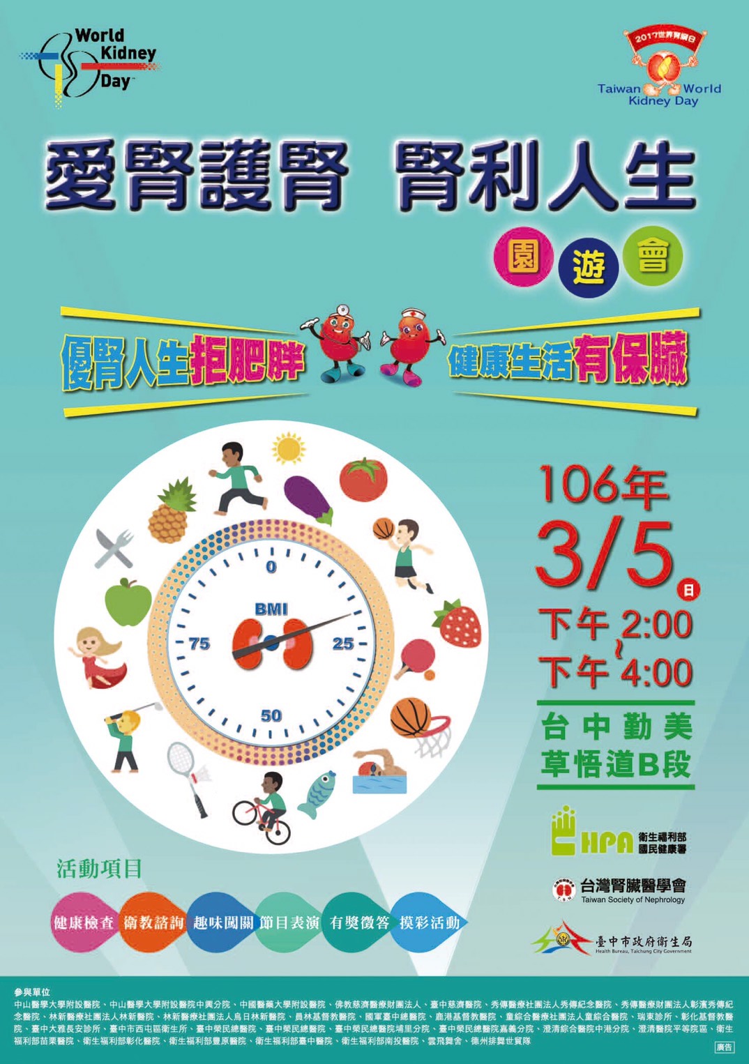 為響應3月9日將到來的世界腎臟日,台灣腎臟醫學會結合台中市政府及中區醫療院所將於明(5)日在草悟道共同舉辦「2017世界腎臟日園遊會」,會場安排健康檢測、衛教諮詢、有獎徵答、摸彩及闖關遊戲等趣味節目,提供民眾腎臟保健知識及免費篩檢服務,歡迎踴躍參加。