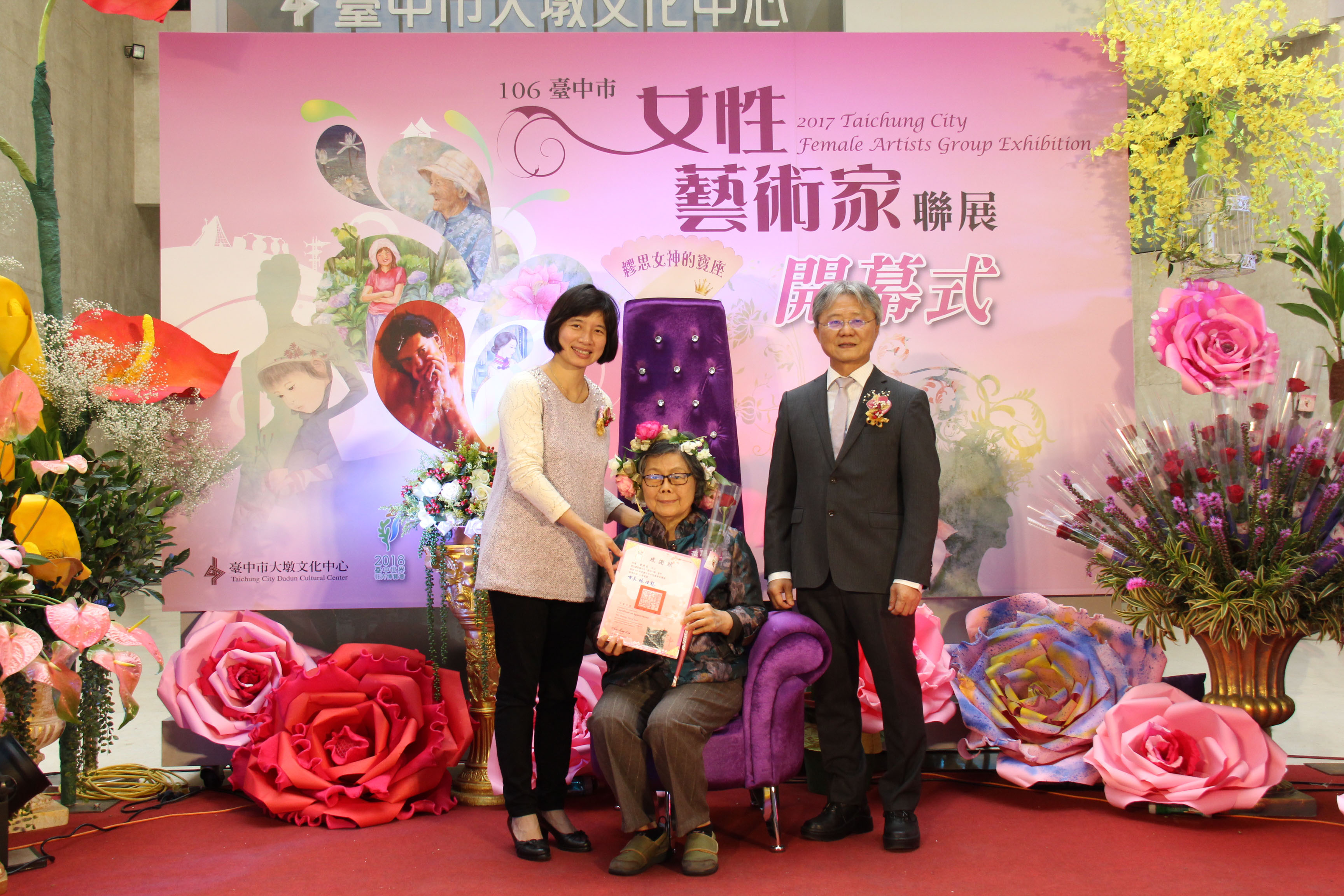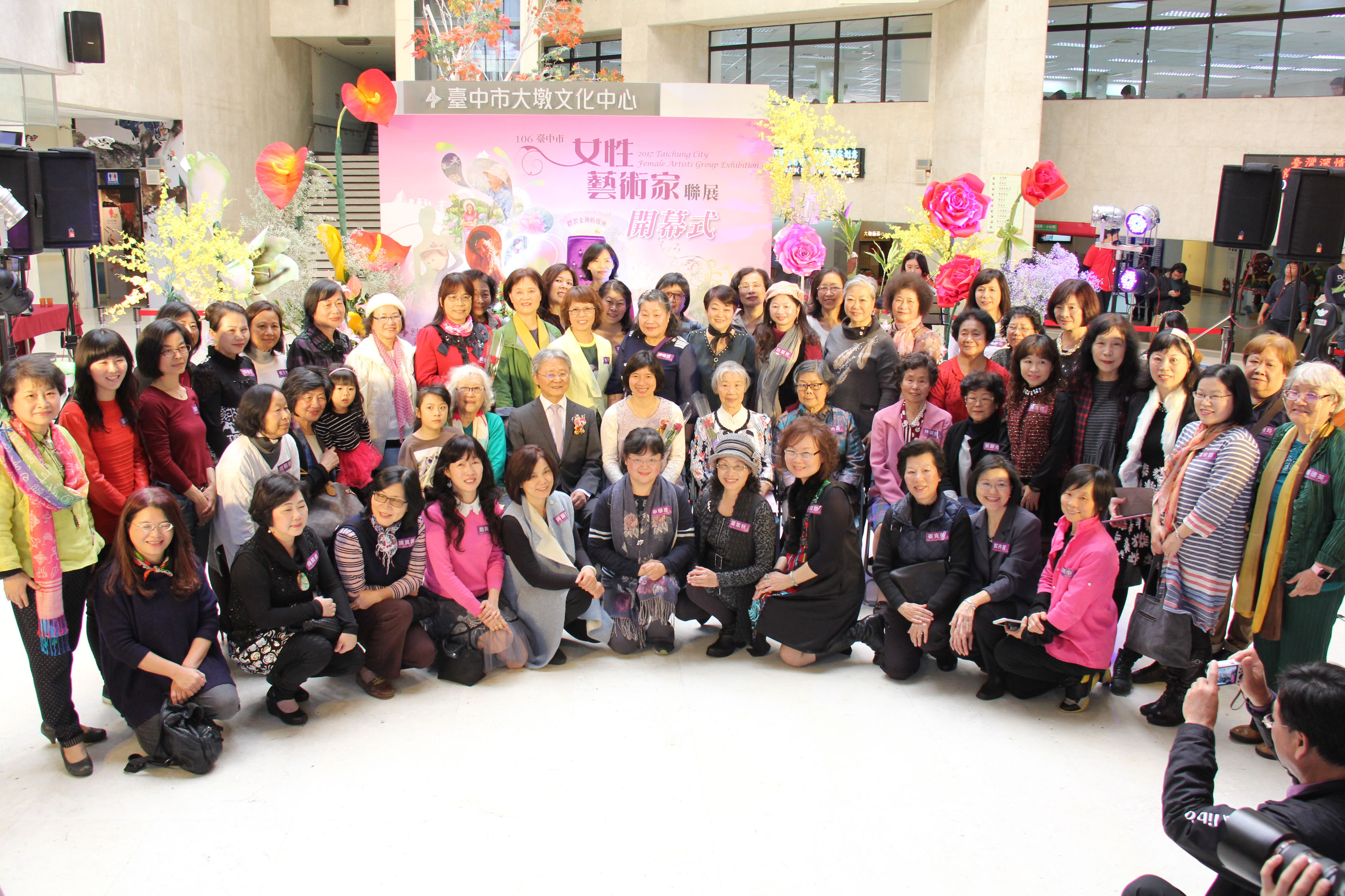 台中市女性藝術家聯展今日隆重開幕,林副市長在文化局長王志誠的陪同下出席致詞,市議員劉淑蘭也到場共襄盛舉,氣氛熱絡;而為迎接2018世界花博,今年開幕現場融入超高低比手作大花美學的大台中花卉植物,並邀請藝術家們登上繆思女神寶座接受讚揚與祝福,讓女性藝術家倍感溫馨與尊榮。