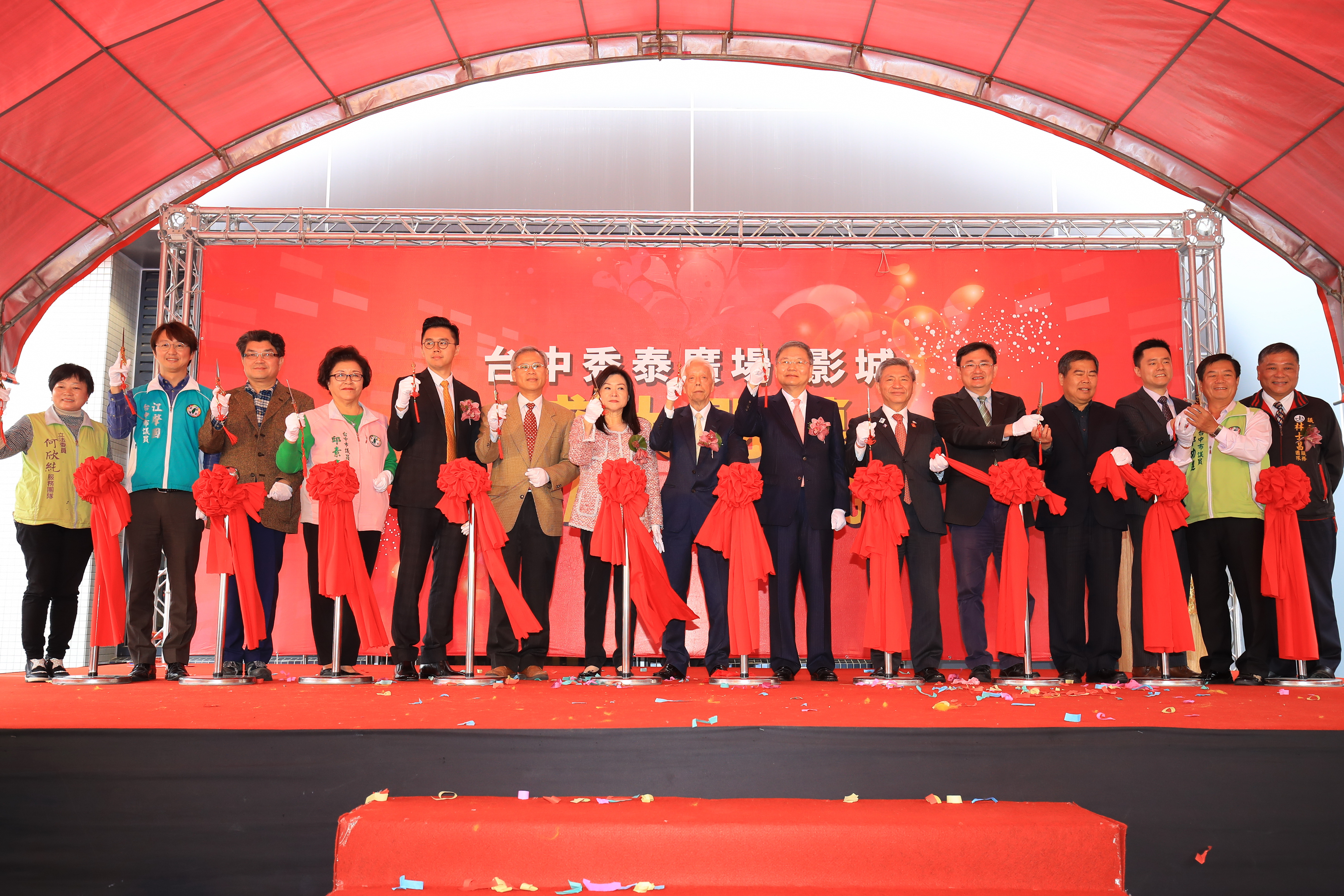 由秀泰影城與南山人壽攜手打造的秀泰廣場站前店今日舉行開幕典禮,包括張副市長、市府新聞局副局長吳超男、都發局副局長紀英村、台中市影視發展基金會副執行長吳蓓琳、財政部國有財產署中區分署長吳文貴、立委黃國書、市議員李中、邱素貞、鄭功進、江肇國、何敏誠、議長林士昌代表、立委何欣純服務處代表、秀泰影城董事長廖治德、南山人壽董事長杜英宗等人共同見證,氣氛熱鬧。