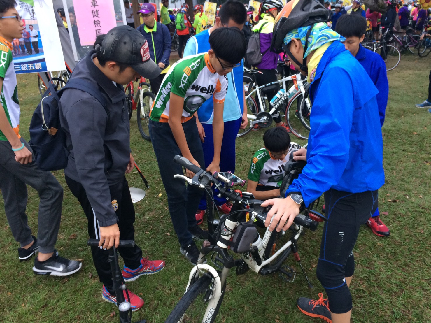 今日日南國中「BIKE機械社」的兩位教練林恒暉和江思翰,率領20位學生到大甲體育場,參加萬眾騎BIKE活動,並在現場免費為民眾單車健檢,民眾反應熱烈,看到學生會騎腳踏車也會維修,都說好厲害。