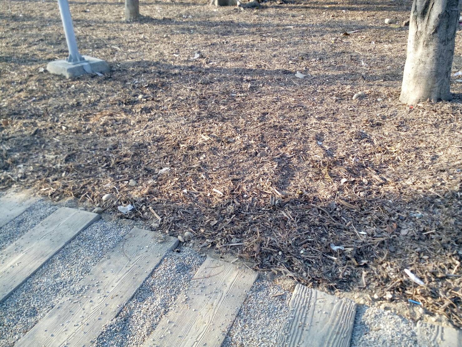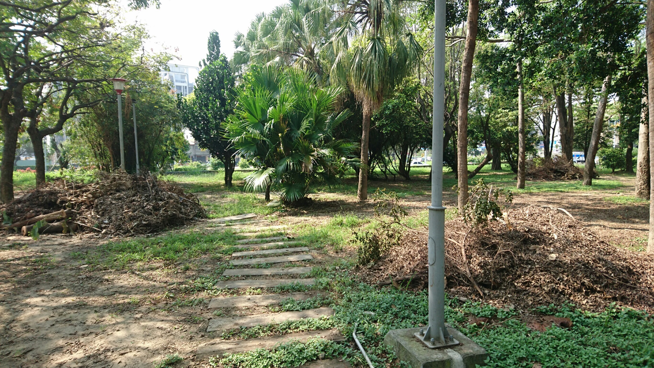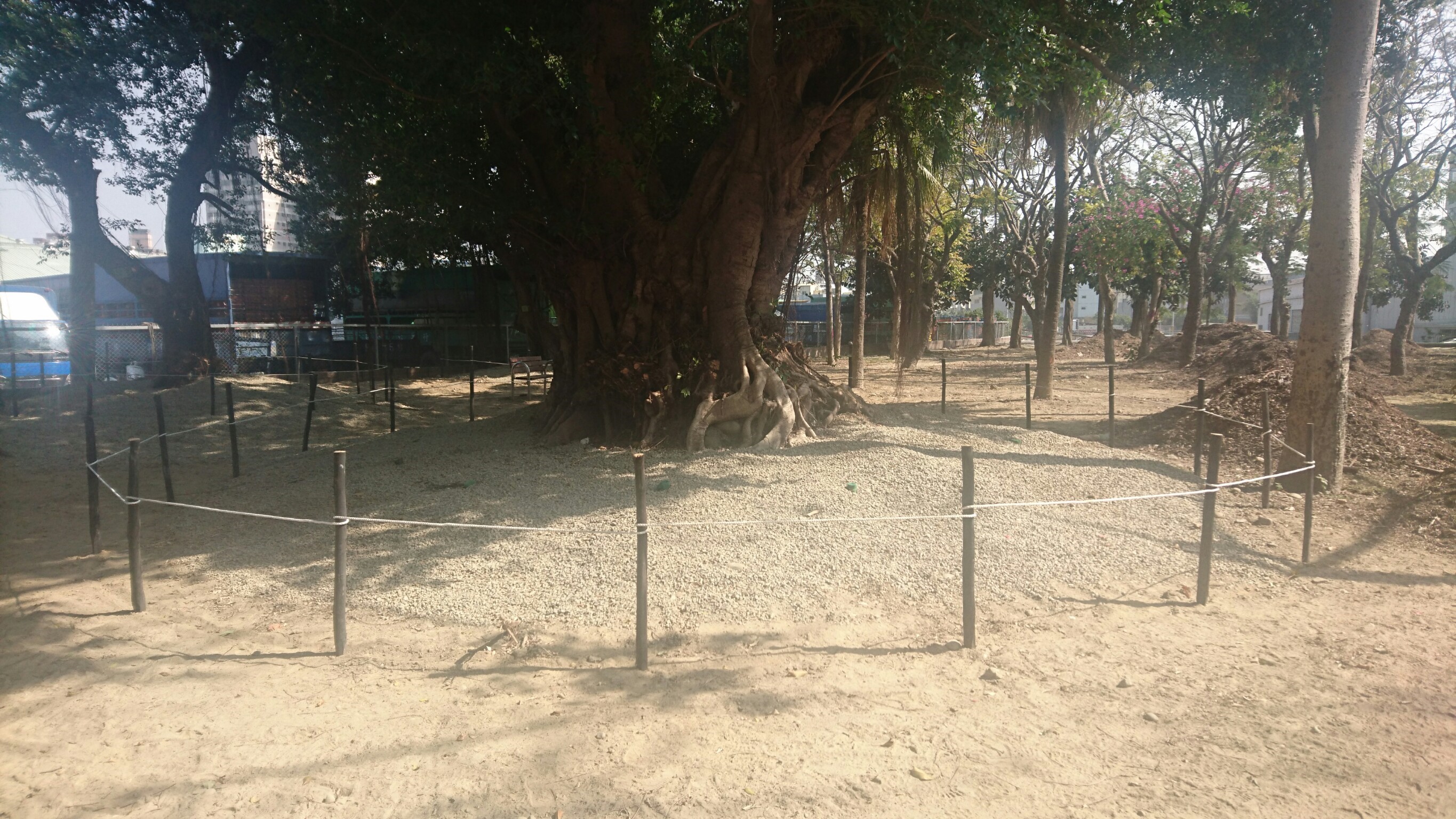 接著在列管榕樹周邊鋪設碎石,以簡易繩索圍籬圈圍,除增加視覺美感,也能保護根系不受人為踩踏壓迫,給予樹根足夠的伸展範圍。最後重新規劃公園步道,以仿木及碎石混合使用,鋪設友善舒適且貼近大自然的人行動線,並配合新步道重新配置照明系統,提高夜間使用的安全性,更於全區範圍內鋪撒木屑,打造可供居民休閒漫步的休憩公園。(3/15*7)*建設局