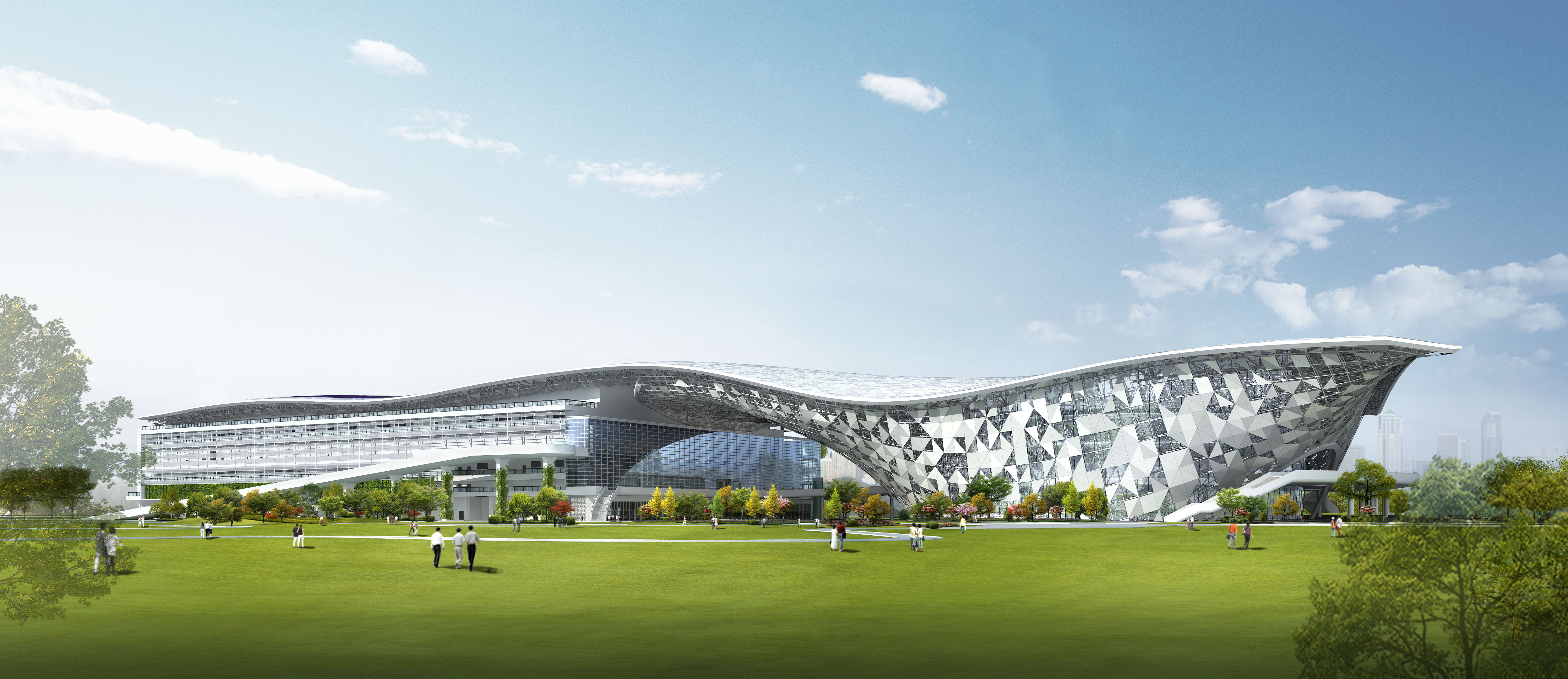 兩側展館樓地板面積合計約20萬7,397平方公尺,中央則有「TREE GATE(大樹之門)」概念的市民廣場,未來將配合水湳經貿園區智慧、低碳、創新等特色,作為產業資訊與國際交流的重要推廣平台,將吸引國內外廠商進駐,讓台中成為世界級的智慧機械之都。