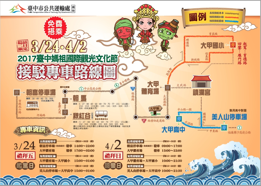 「台中媽祖國際觀光文化節接駁車」行駛日期(時間)及搭乘資訊如下: