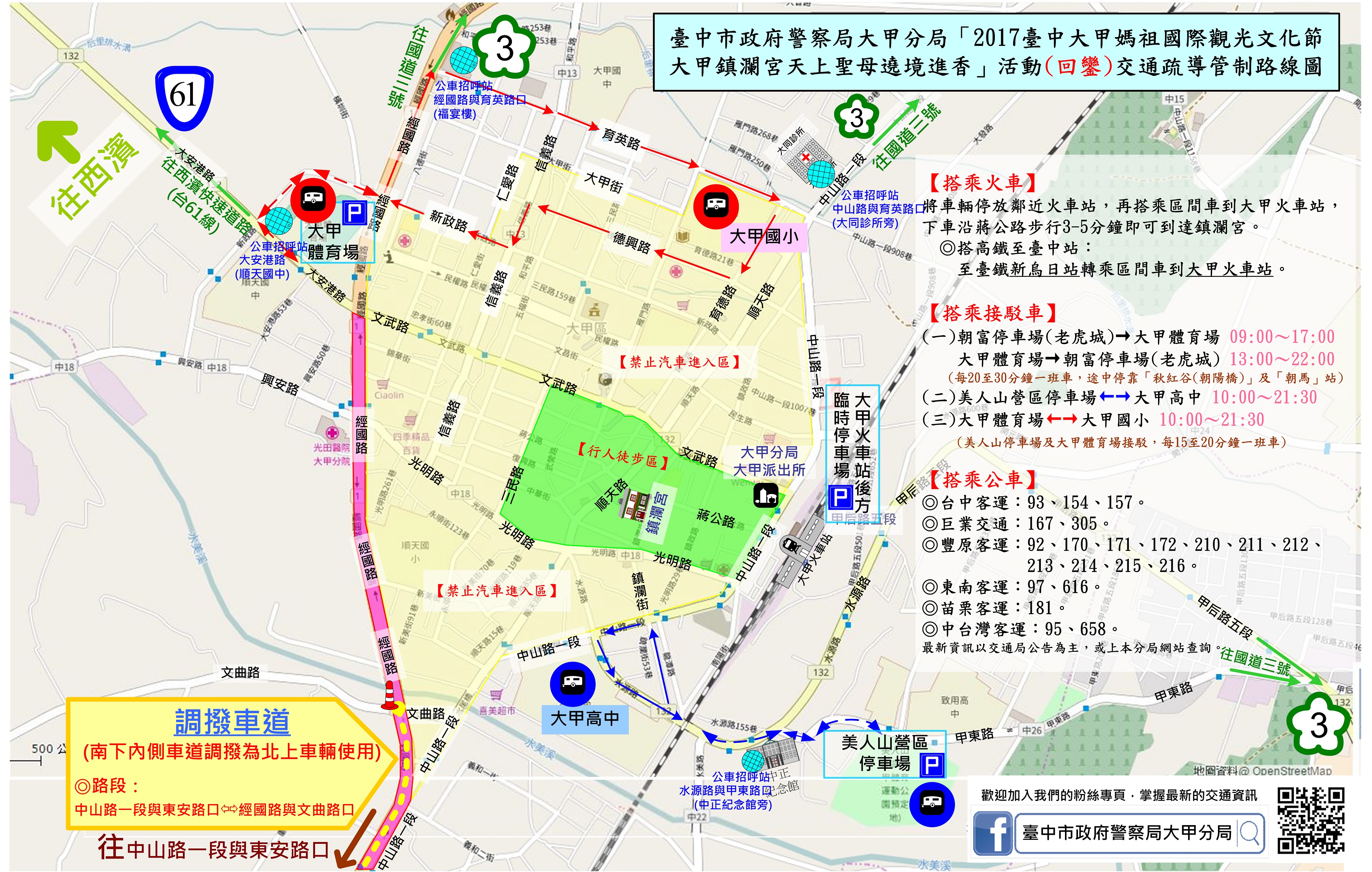 交通局長王義川表示,由台中前往大甲區的民眾,可至朝富路老虎城旁朝富停車場搭車至大甲體育場(沿途行經「秋紅谷(朝陽橋)」、「朝馬」站),再轉乘中型巴士接駁車至大甲國小後,以步行方式前往鎮瀾宮;自行開車的民眾,可在大甲區美人山營區停車場搭乘接駁車到鄰近市區的大甲高中,再步行前往鎮瀾宮。