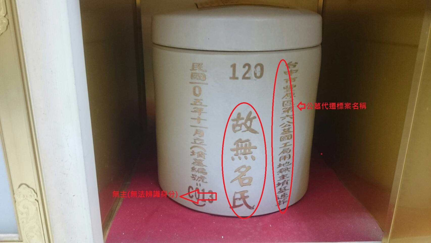 有林姓家屬陳情先人墳墓被列為「無主墳墓」。生管處說明,由於在遷葬過程中,並未受理該後代家屬前來登記墳墓遷葬起掘事宜,該處在代為遷葬起掘,舉行法會安置,並於骨灰罐上標示出處(即墓區)、先人名諱及「台中市豐原區第六公墓國工局用地無主墳墓遷葬」。其中,所稱「無主墳墓」是指「無家屬辦理登記起掘」,而非指無後代子孫或無法辨識先人身分;如所代遷葬的墳墓無法辨識先人身分,才會於納骨罐中刻上「無名氏」。