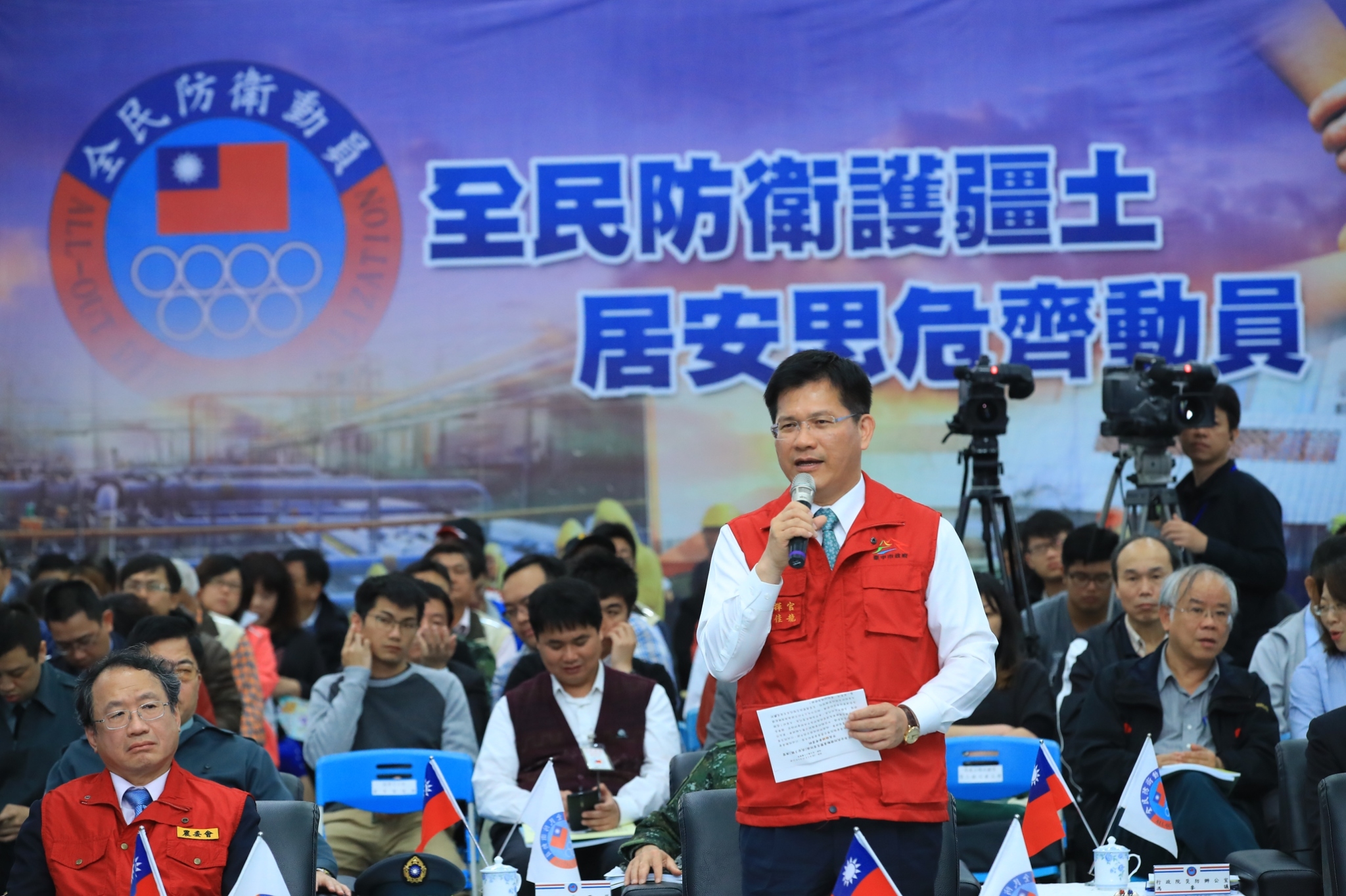 林市長擔任演習主推官,行政院動員會報指導官農委會副主委黃金城、統裁部副統裁官空軍副司令張哲平中將、副市長張光瑤等人皆出席,除驗證成果,並為參演人員加油打氣。