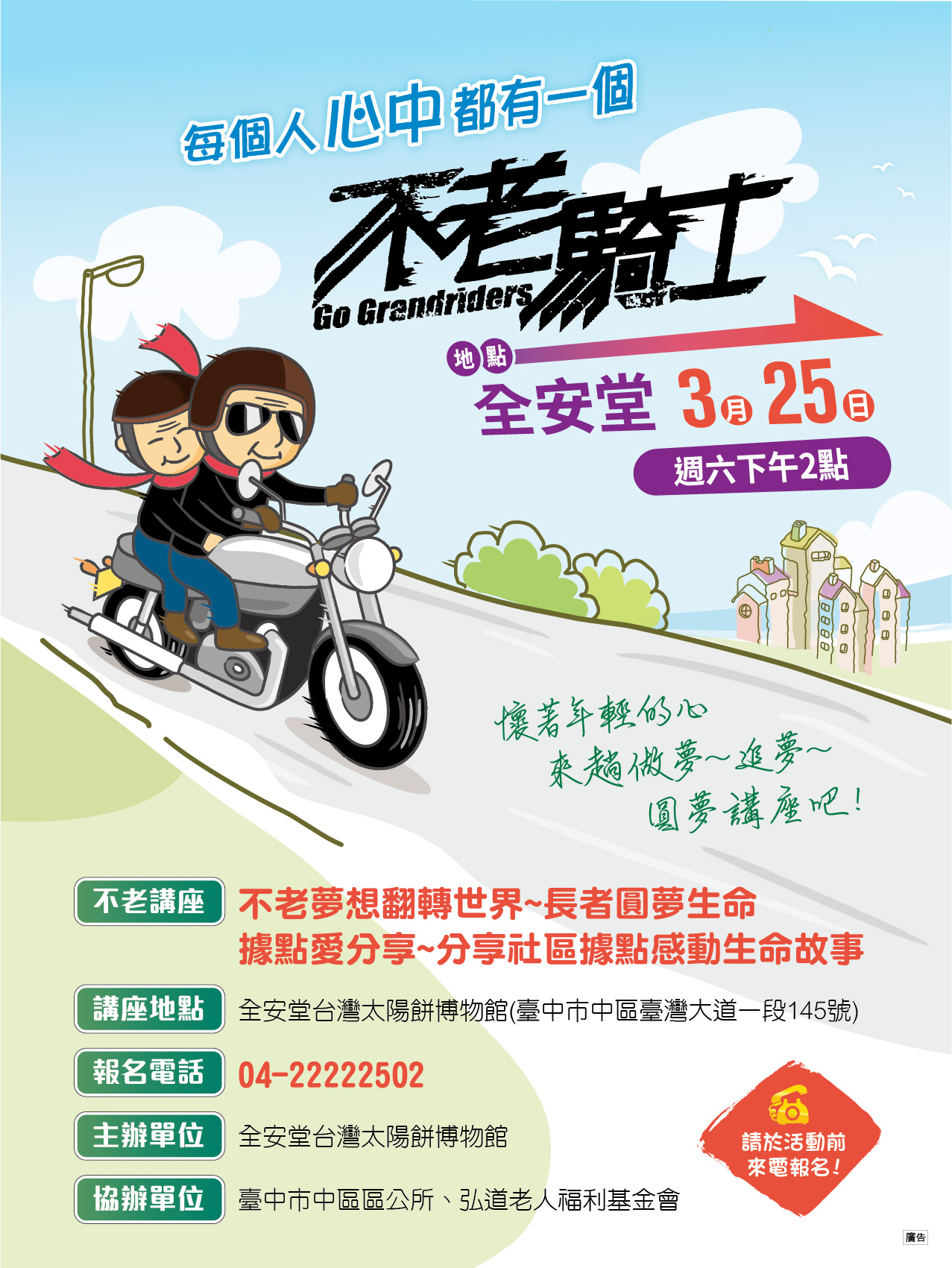 台中市中區區公所與全安堂台灣太陽餅博物館、弘道老人福利基金會訂於明(25)日下午2時在全安堂台灣太陽餅博物館合辦不老講座,以不老夢想翻轉世界、社區據點愛分享為主題,分享如何規劃高齡的樂活人生,以及加入社區關懷據點,建構創造樂活台中的銀髮樂園,歡迎踴躍參加。