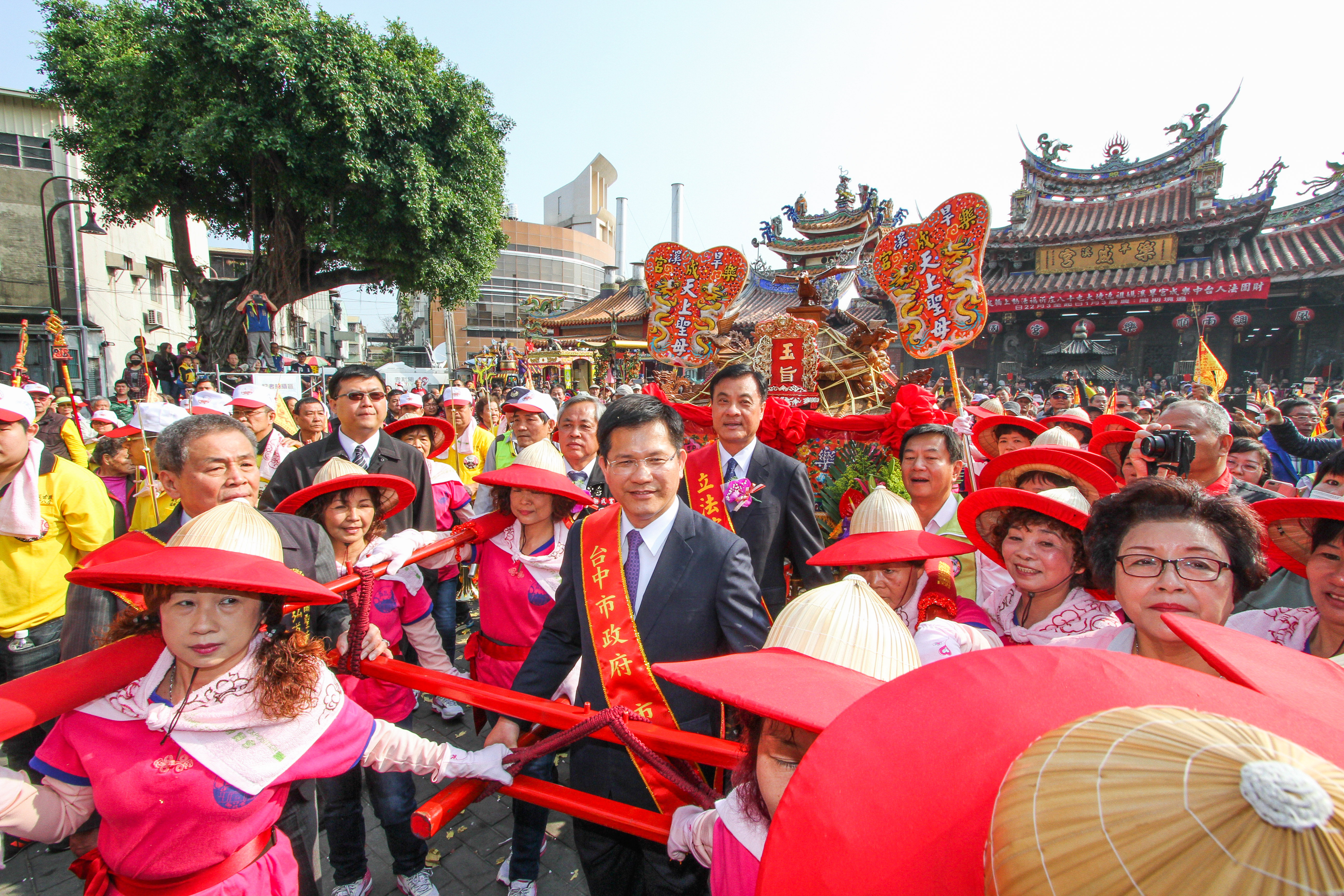 「旱溪媽祖暨大屯十八庄聯合遶境祈福活動」源自清朝道光三年,傳承至今已有195年歷史。林市長今早就到樂成宮恭迎媽祖入座,並點燃震撼力十足的「起馬炮」,宣告遶境隊伍起駕,信眾連綿不絕,熱鬧非凡;立法院長蘇嘉全、民政局長蔡世寅、立委黃國書、市議員邱素貞、鄭功進、江肇國、張滄沂、樂成宮董事長郭松益等人也皆到場共襄盛舉。