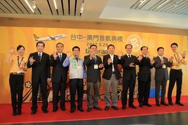 台灣虎航今日在台中國際機場舉行「台中-澳門」首航儀式,台中市政府副秘書長郭坤明、觀光旅遊局副局長陳育正、市議員楊典忠、民航局台中航空站主任張瑞澍、台灣虎航董事長張鴻鐘、營運長廖崇良、台中市旅行商業同業公會理事長黃耀德、華信航空執行副總經理張酉光、中華航空台中分公司總經理賴祥光等人共同出席,歡迎首航到台中的旅客,也歡送首航旅客前往澳門。