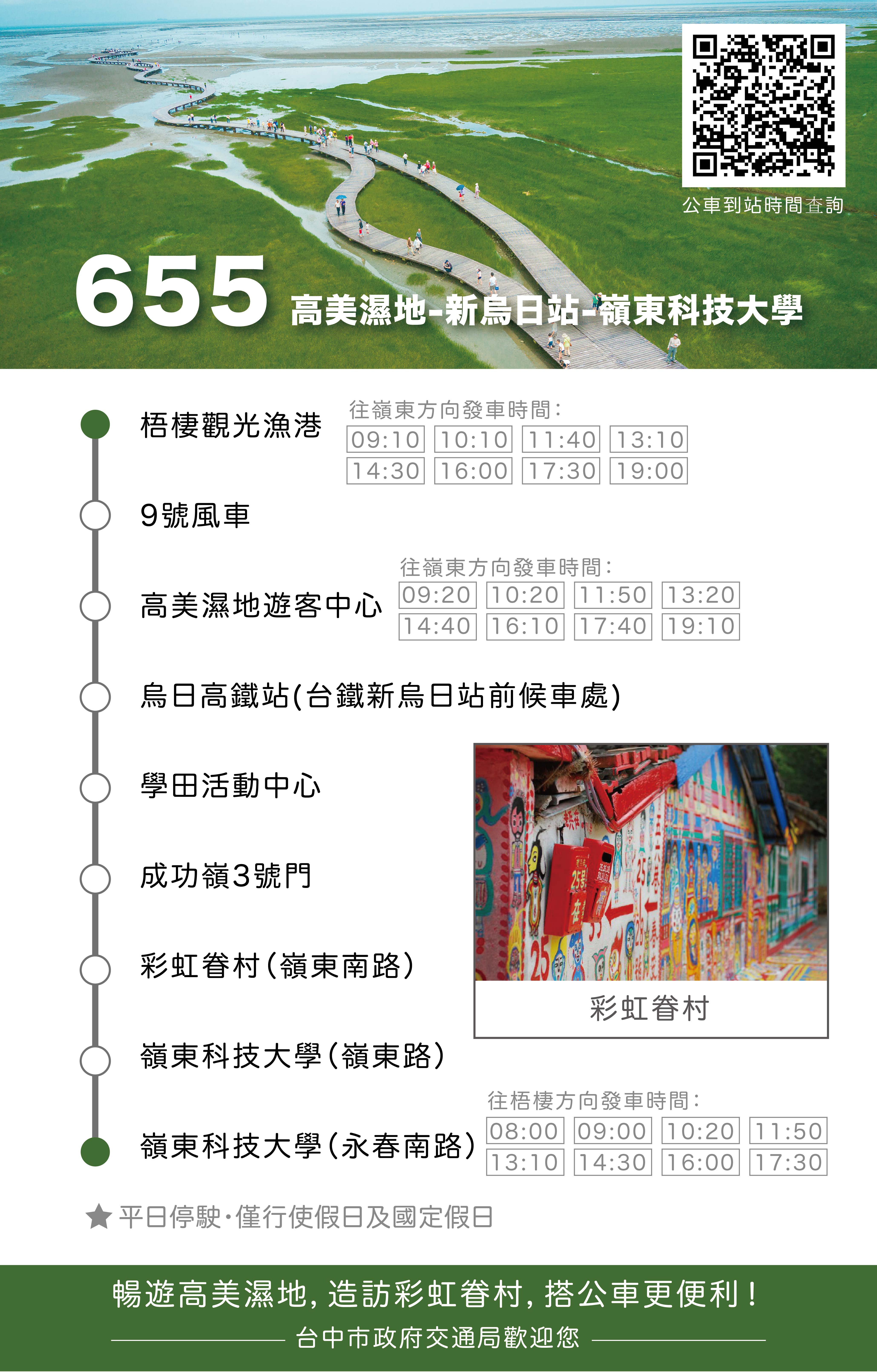 交通局指出,由於高美濕地遊客量單月可達10萬人次,加上高美濕地遊客服務中心、跨海景觀橋等重要觀光設施也已陸續完成,市府結合大眾運輸服務,方便旅客規劃一日遊行程,欣賞高美濕地及周邊美景,更可同時品嚐海線地區特色美食。(4/6*1)*交通局