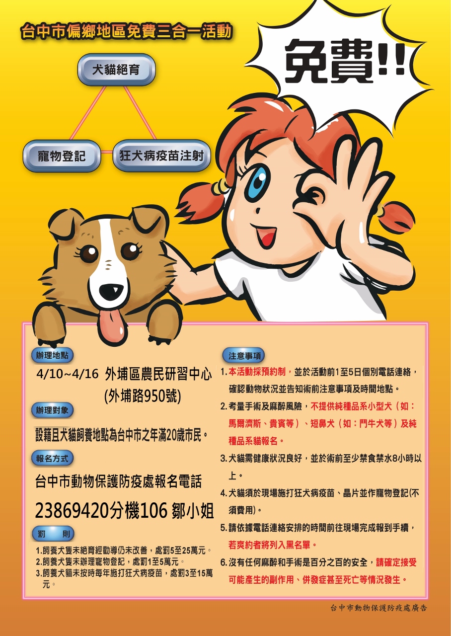 動保處指出,犬貓絕育、狂犬病疫苗注射及寵物登記活動採預約制,動保處將於活動前個別電話聯絡,確認動物狀況,並告知相關注意事項,活動對象為設籍台中市且年滿20歲的市民。