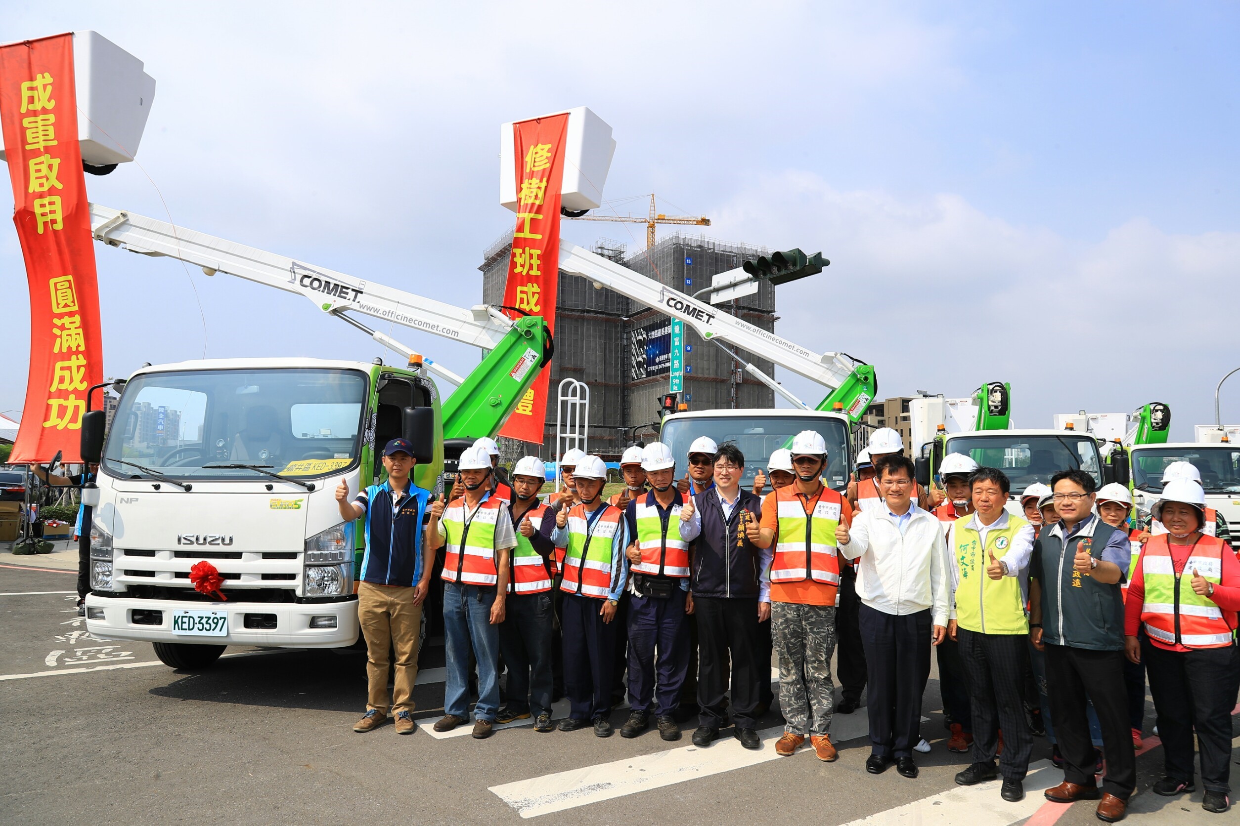 林市長表示,都市路樹問題困擾地方許久,每當颱風來襲,落葉及樹木斷枝不僅破壞市容景觀,也會造成地方交通與環境危慮,市府聽到地方聲音,因此特別動用第二預備金,採購8台高空作業車分配市轄8區,3台建設局留用,讓地方問題可以透過區公所直接解決,縮短城鄉差距,強化地方自治。