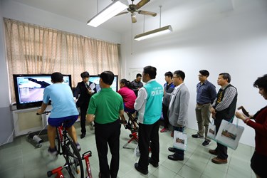 此外,還有兩個突顯全球競合力目標的體驗區,自行車車台區結合物聯網概念提供車台體驗,學生一邊騎車、一邊可以透過螢幕看到里程數及熱量消耗,更可以跟其他好手一較長短;師生創客課程成果區則有結合感應元件與Scratch程式設計的完全手作「打地鼠」電玩,與全球程式設計課程先驅接軌。