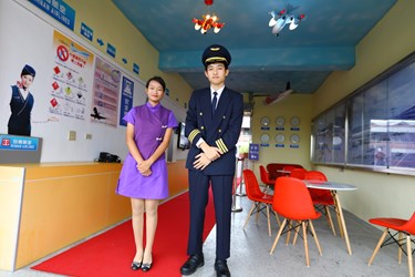 緊接著進入艙門,有機師與空姐的人形立牌,讓每位學生可以角色扮演,拍照打卡,沿著二樓走廊,地板變成了機場航道,一路前行就像是搭乘著飛機旅行;二樓教室的窗台也掛著七大學習領域的學習內容,學生可在走廊航道上透過瀏覽海報內容來認識今年的主題國家日本。