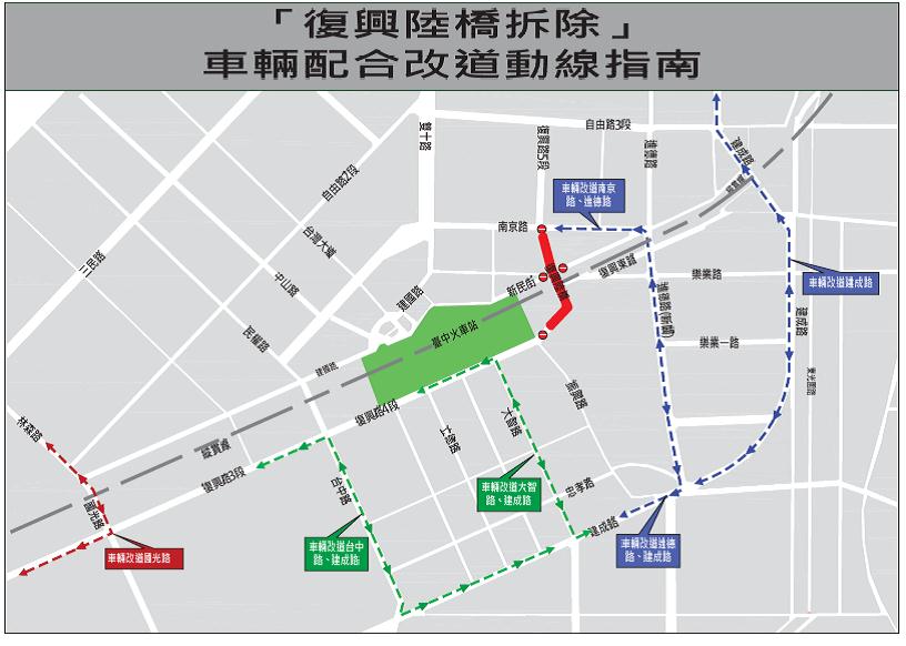 復興陸橋封閉期間,原本利用復興陸橋來往的車輛,須提前改道行駛;由復興路四段往北方向的車輛,建議於台中路或大智路右轉,至建成路左轉後,繞經自由路,再轉入復興路五段。