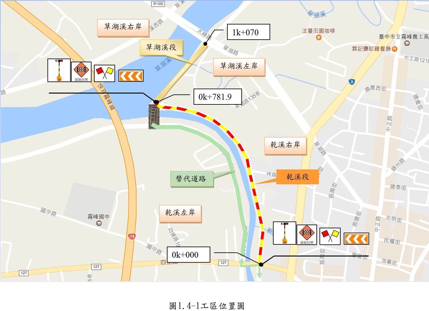 霧峰區乾溪自行車道起於大峰橋,沿草湖溪左岸,途經北峰橋,串聯乾溪右岸,終至中正橋,全長1.07公里,明日起至106年7月15日止沿乾溪路開挖施工,為維護民眾安全,施工期間將封閉道路約800公尺。