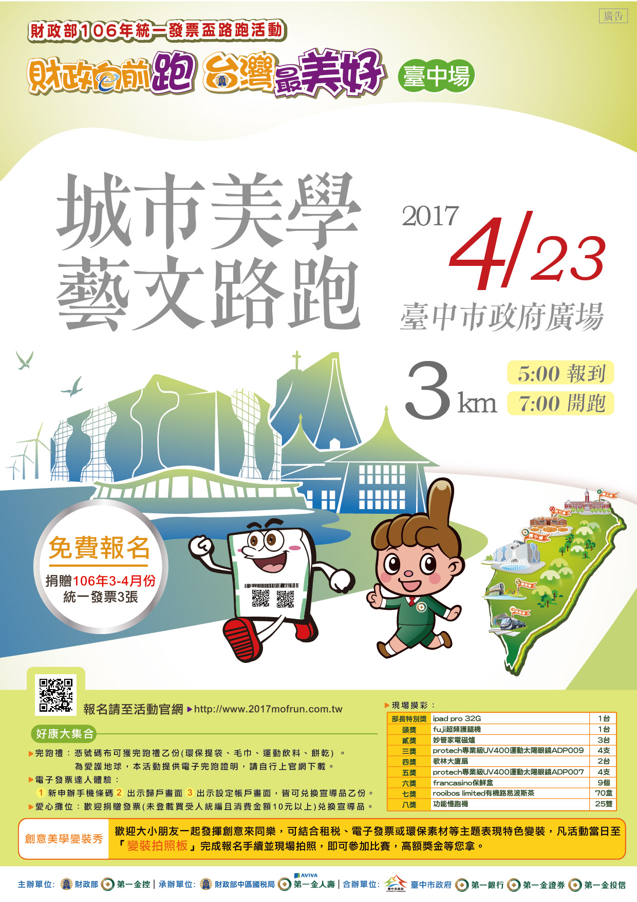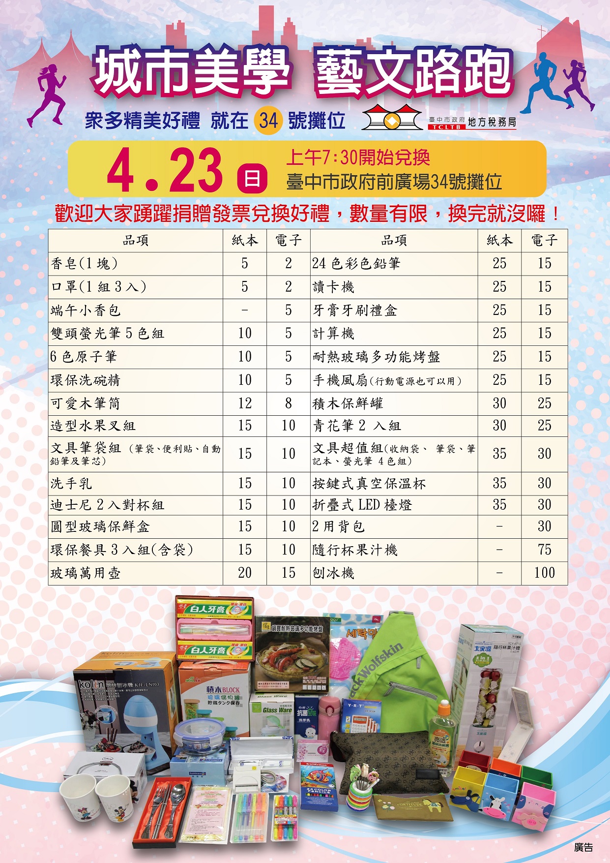 4/23統一發票盃路跑就在台中市政府前廣場,歡迎大家到34號「台中市政府地方稅務局」攤位捐發票換好禮!