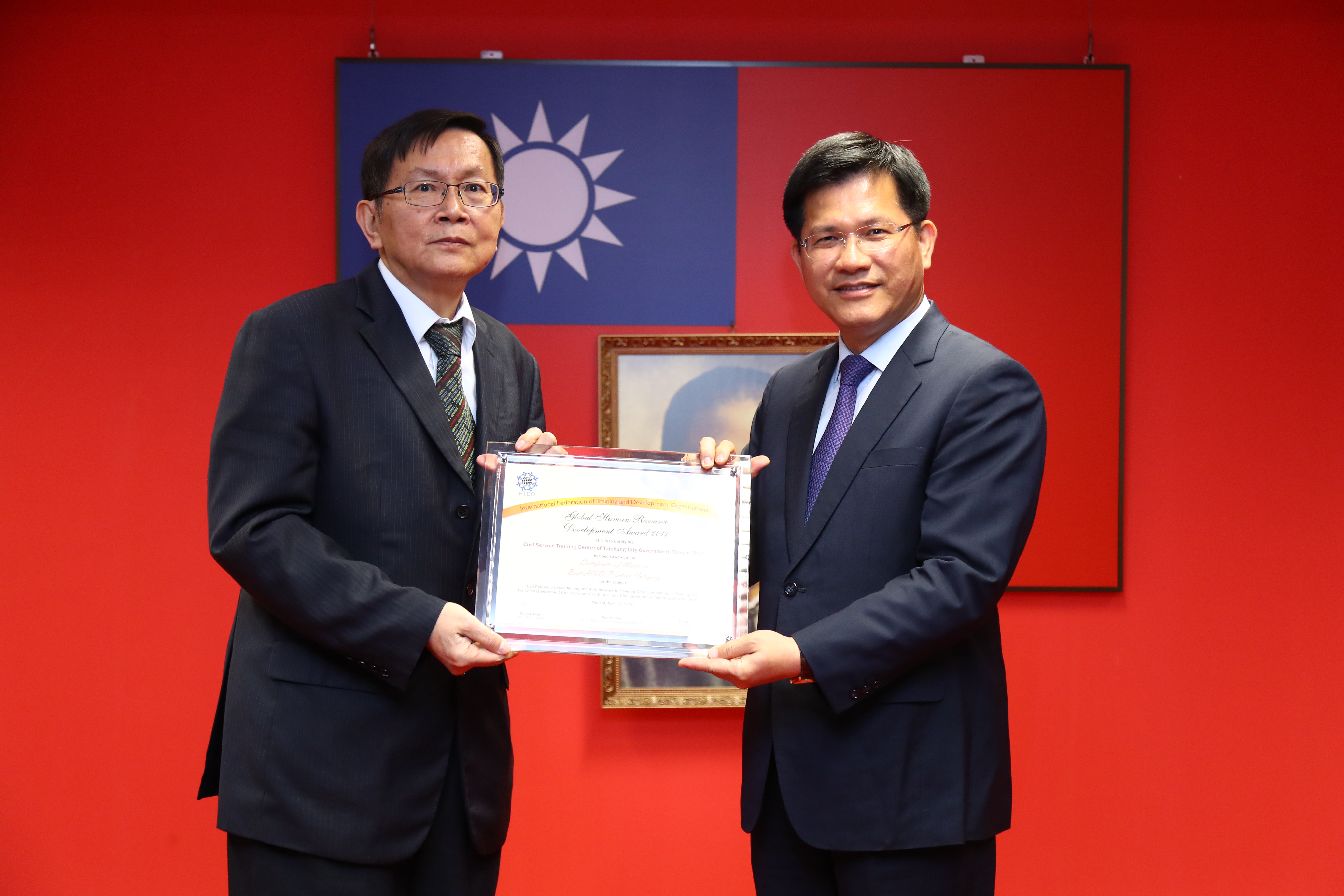 台中市公務人力訓練中心今年參加聯合國教科文組織下的國際培訓總會(IFTDO)人力資源評選,以「運用循證理論發展以核心職能為基礎之訓練地圖-打造台中市政府π型公務人才」為題旨,榮獲最佳人力資源管理類優等獎,為台灣唯一獲獎機關,於11日在阿曼由大會總裁Ghalib Saif Al Hosni 博士和阿曼公主Muna Al Said共同頒獎,並於今日在市政會議上獻獎。