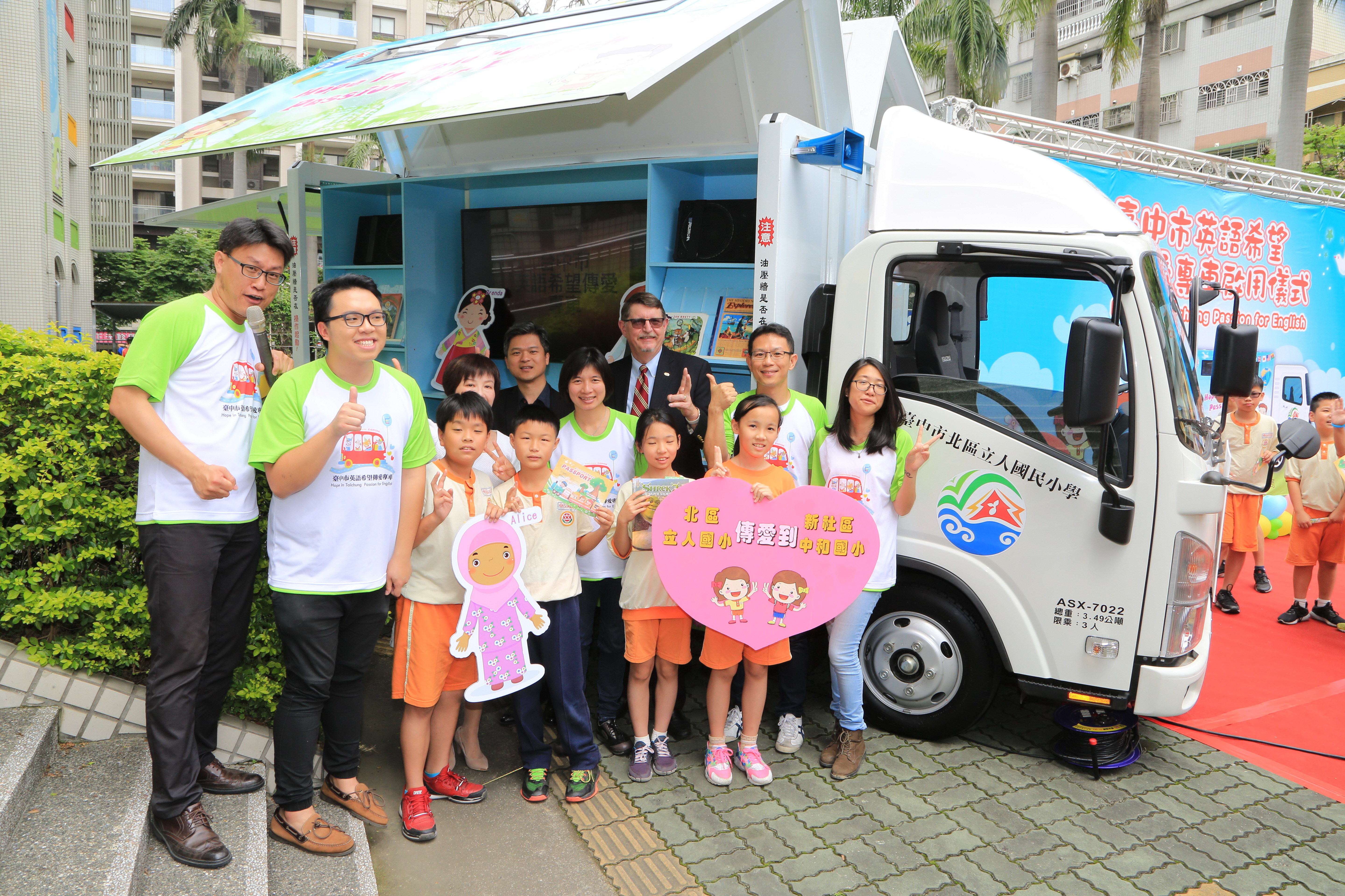 為推動英語教育、提升學習力,台中市政府教育局打造首部「英語傳愛行動專車」,配有E化教學設備、小型行動圖書館,由中師搭配美籍英語教學助理,透過行動學習、合作學習及創客(Maker)的概念,活化英語教學,今(25)日在北區立人國小啟航,接著將傳愛到新社區中和國小,預計這學期巡迴72所國小。副市長林依瑩表示,學童有這樣的學習資源很幸福,鼓勵孩子不要害怕、勇於嘗試,巡迴學校也將以47所偏鄉小學優先,盼讓中市的孩子都與英語「零距離」。