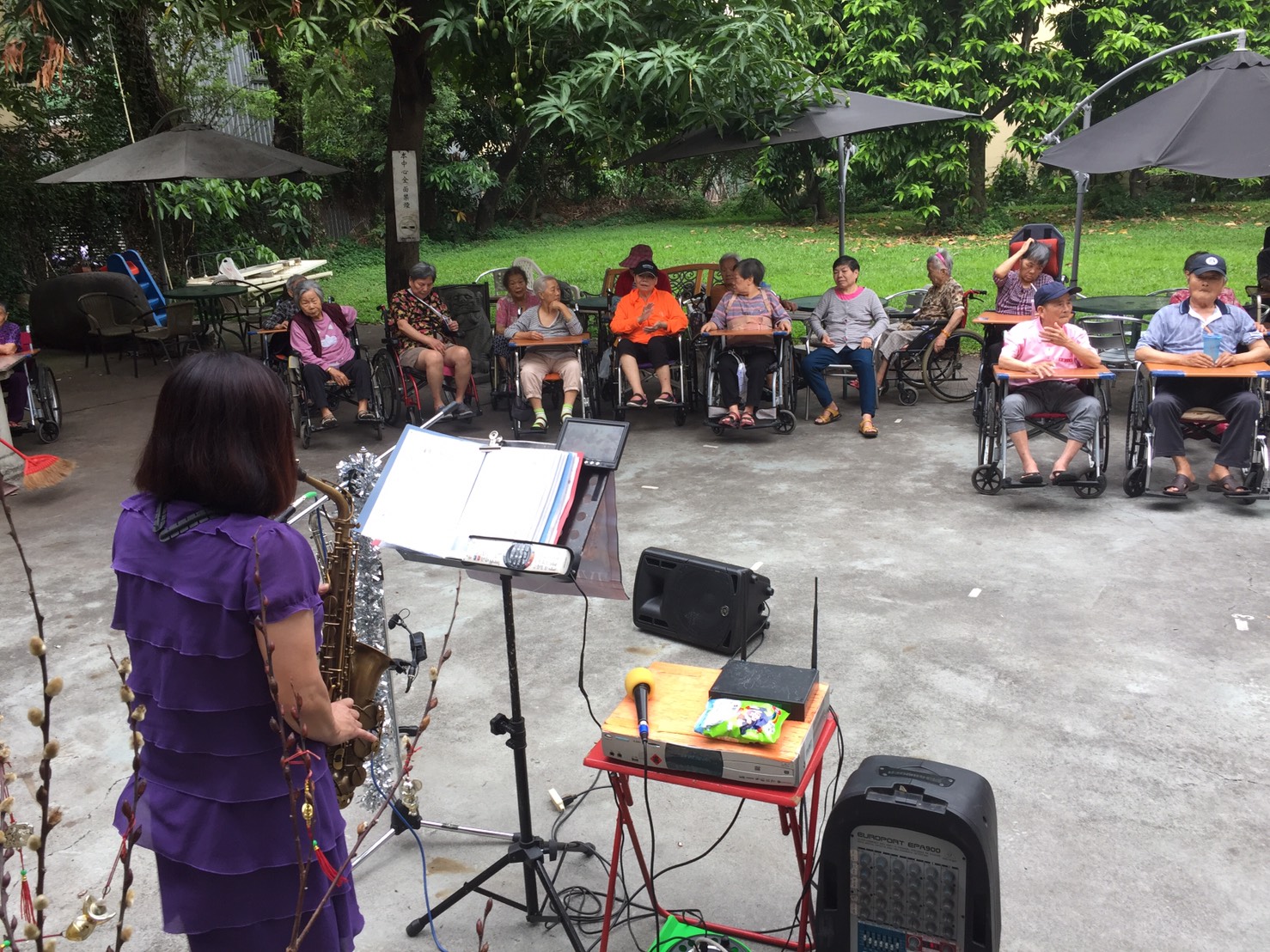 「106年度母親節關懷長者音樂饗宴」今日由電音薩克斯風樂團帶來國台語懷舊金曲,包括望春風、燒肉粽等老歌,更開放現場長者點歌;中興商圈管委會也烹煮長壽麵線為長者暖壽蓄福,氣氛溫馨。