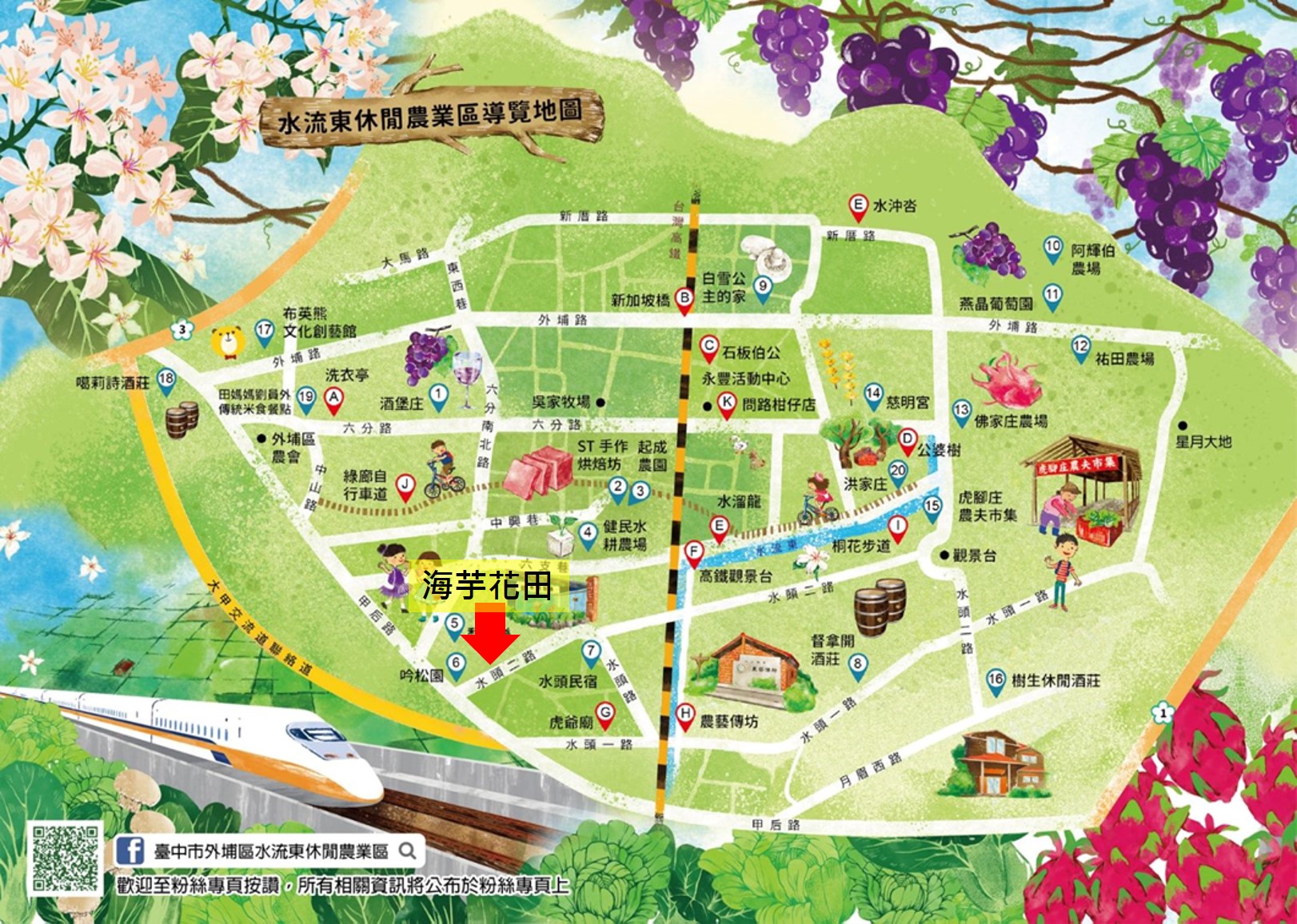 市府農業局表示,水流東休閒農業區素以火龍果、釀酒葡萄聞名,區內也有許多酒莊,遊客可前往體驗採果與製酒,還可到虎腳庄農夫市集採買地產地銷的新鮮農產品,品嘗遠近馳名的田媽媽傳統米食,歡迎至外埔體驗農村風貌。