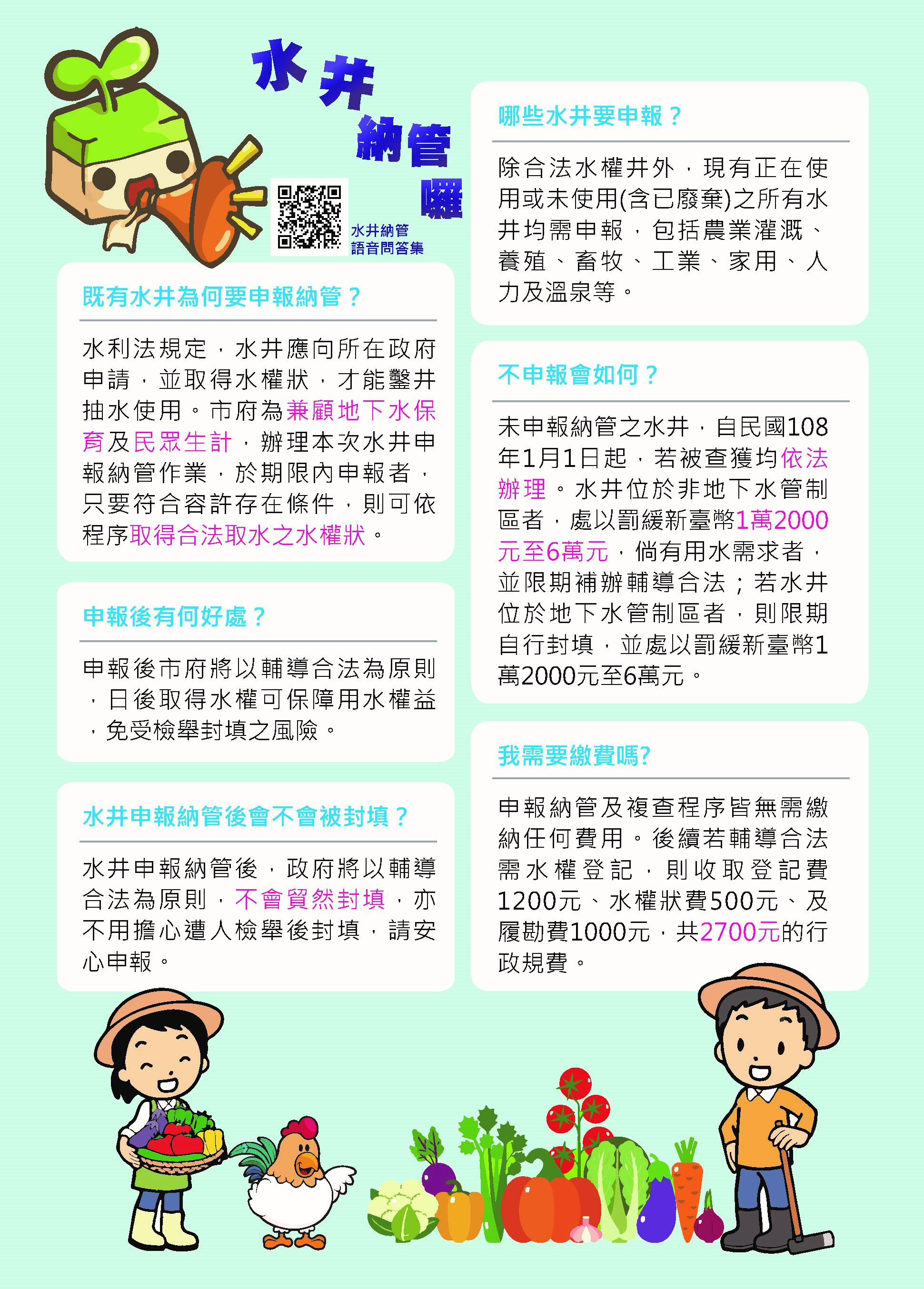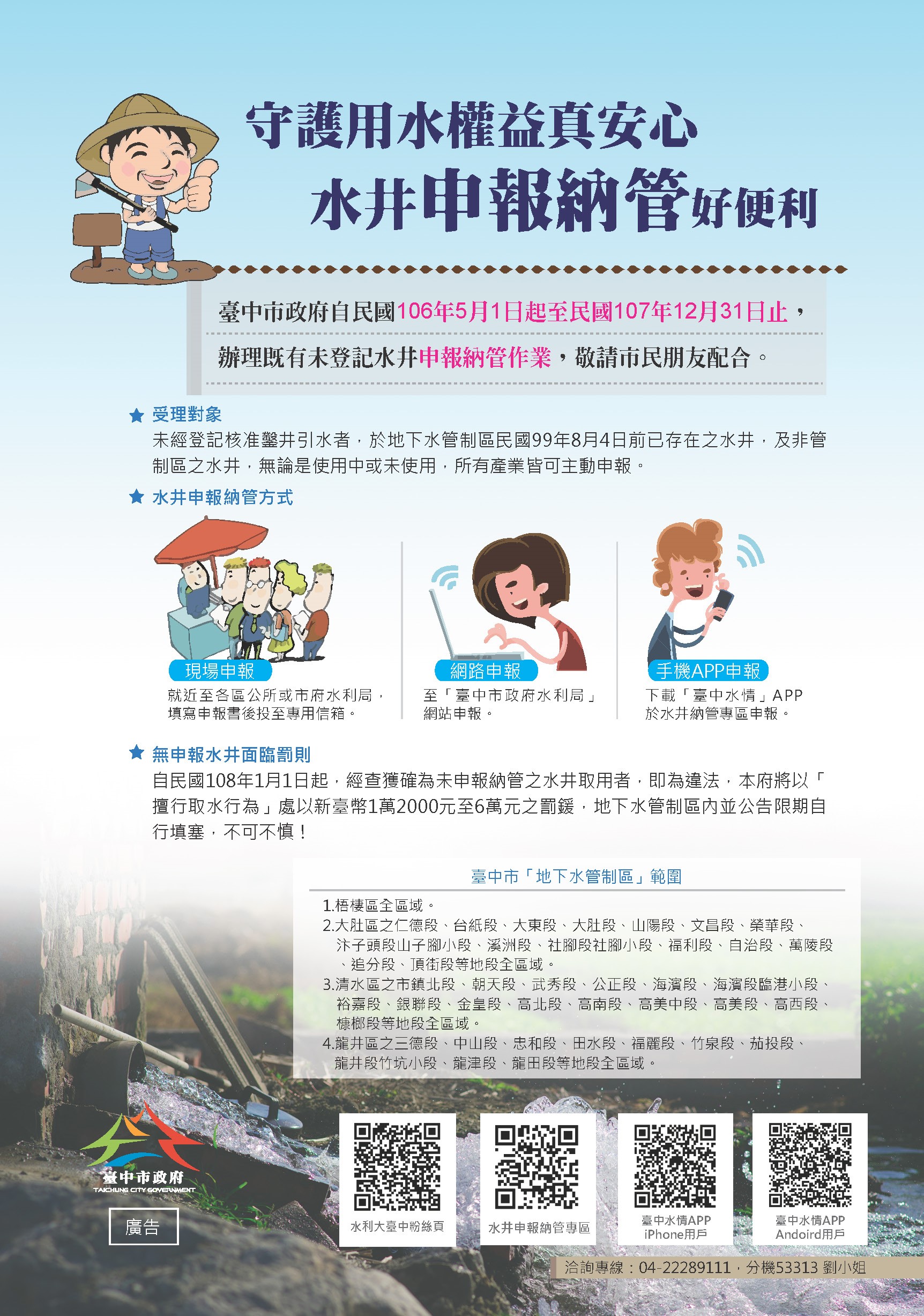 為便利民眾申報,市府在各區公所及水利局皆設有水井申報納管專用信箱,即日起,市府也會透過29區地方說明會及各種宣傳管道,主動輔導民眾辦理。
