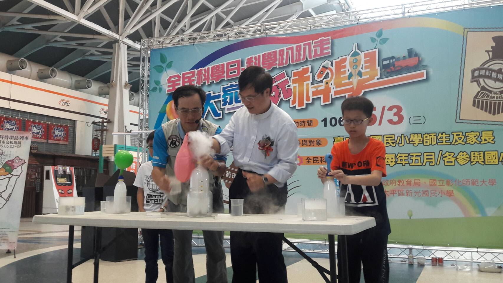 為推動科學知識普及,台中市政府教育局與科技部、國立彰化師範大學、台灣鐵路管理局合作,舉辦「106年台灣科普列車系列活動」,今(3)日列車從苗栗開到台中,多元豐富的動、靜態科學體驗活動在台鐵新烏日站熱鬧登場,還有益智、闖關遊戲。市府教育局副局長劉火欽與160位中市科學小尖兵一起迎接列車進站,盼讓科學貼近生活、引導學童從中學習新知。