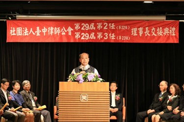 台中律師公會第29屆第2、3任理事長交接典禮,包括市府法制局長陳朝建、台灣高等法院台中分院院長陳東誥、高等法院台中分院檢察署檢察長江惠民、台中高等行政法院院長許金釵、台中地方法院院長江錫麟、台中地方法院檢察署檢察長張宏謀、財團法人法律扶助基金會台中分會會長趙建興、南投分會會長黃秀蘭、苗栗分會會長魏早炳、財團法人犯罪被害人保護協會台中分會主委林坤賢等人到場觀禮,場面隆重溫馨。