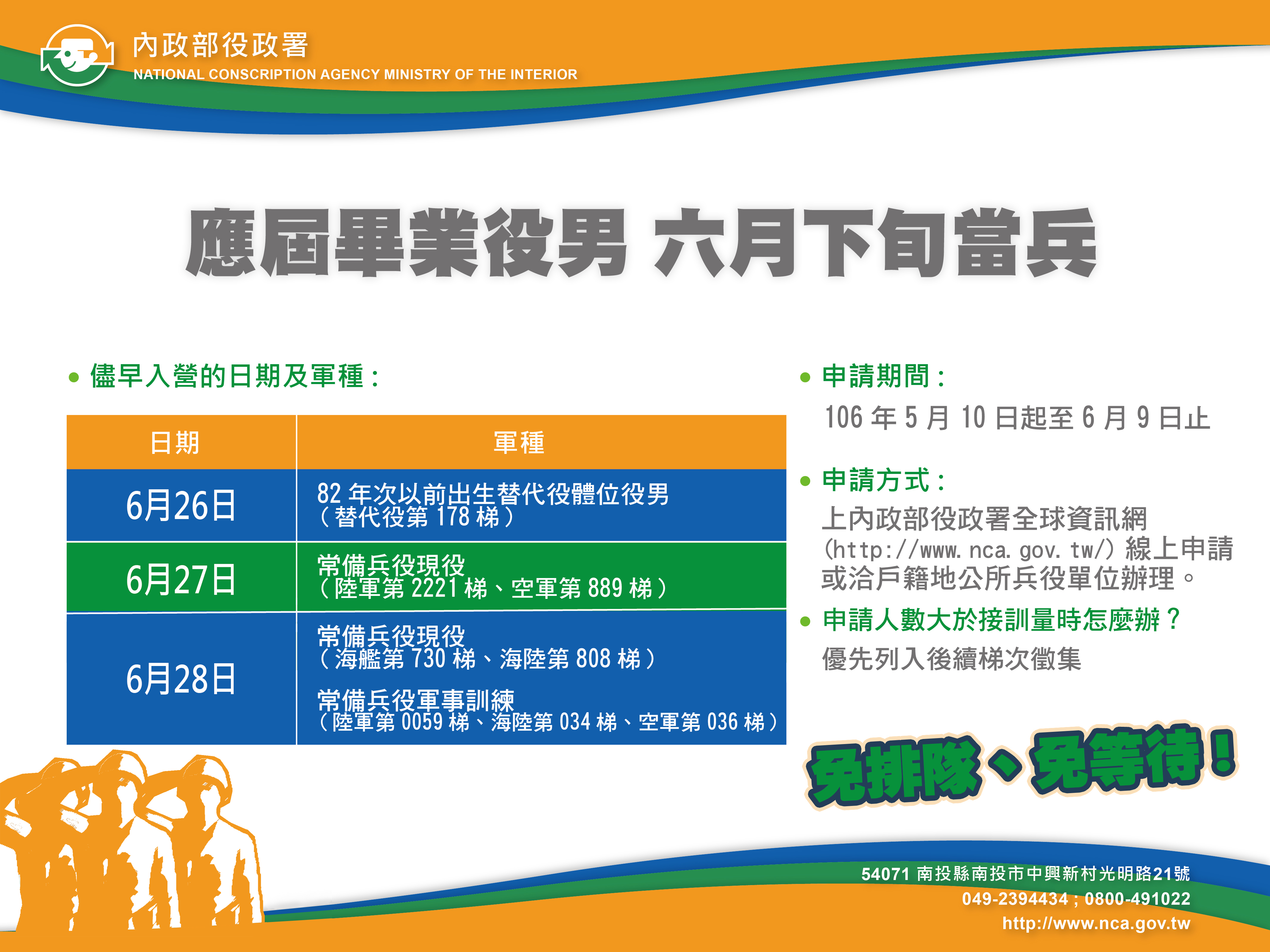 為紓緩每年下半年待徵役男入營壅塞情形,配合內政部針對106年應屆畢業生(原核定緩徵至6月30日止),確定不再繼續升學,而有意願儘早履行兵役義務,自5月10日起至6月9日止,可利用網路或向戶籍地區公所申請於6月下旬儘早入營服役。