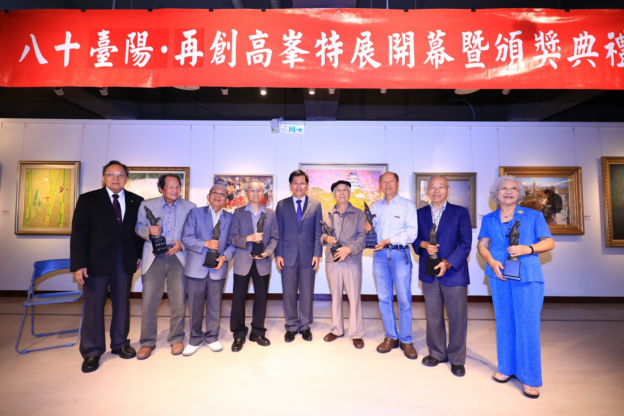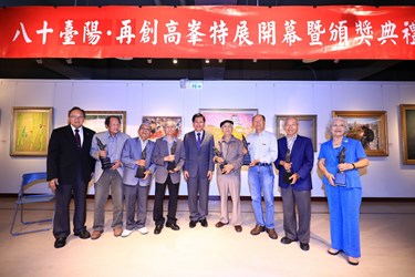 今日開幕式由林市長主持,並頒發「九十、八十高齡資深大師暨五十年大師貢獻獎」及中部地區徵集優秀作品獎項,教育部參事卓英豪、台中高分院庭長吳重政、前總統府資政廖了以、台中扶輪社社長古亭河、久倫環資電子股份有限公司董事長蘇真境、維他露基金會執行長侯至祥均到場共襄盛舉。