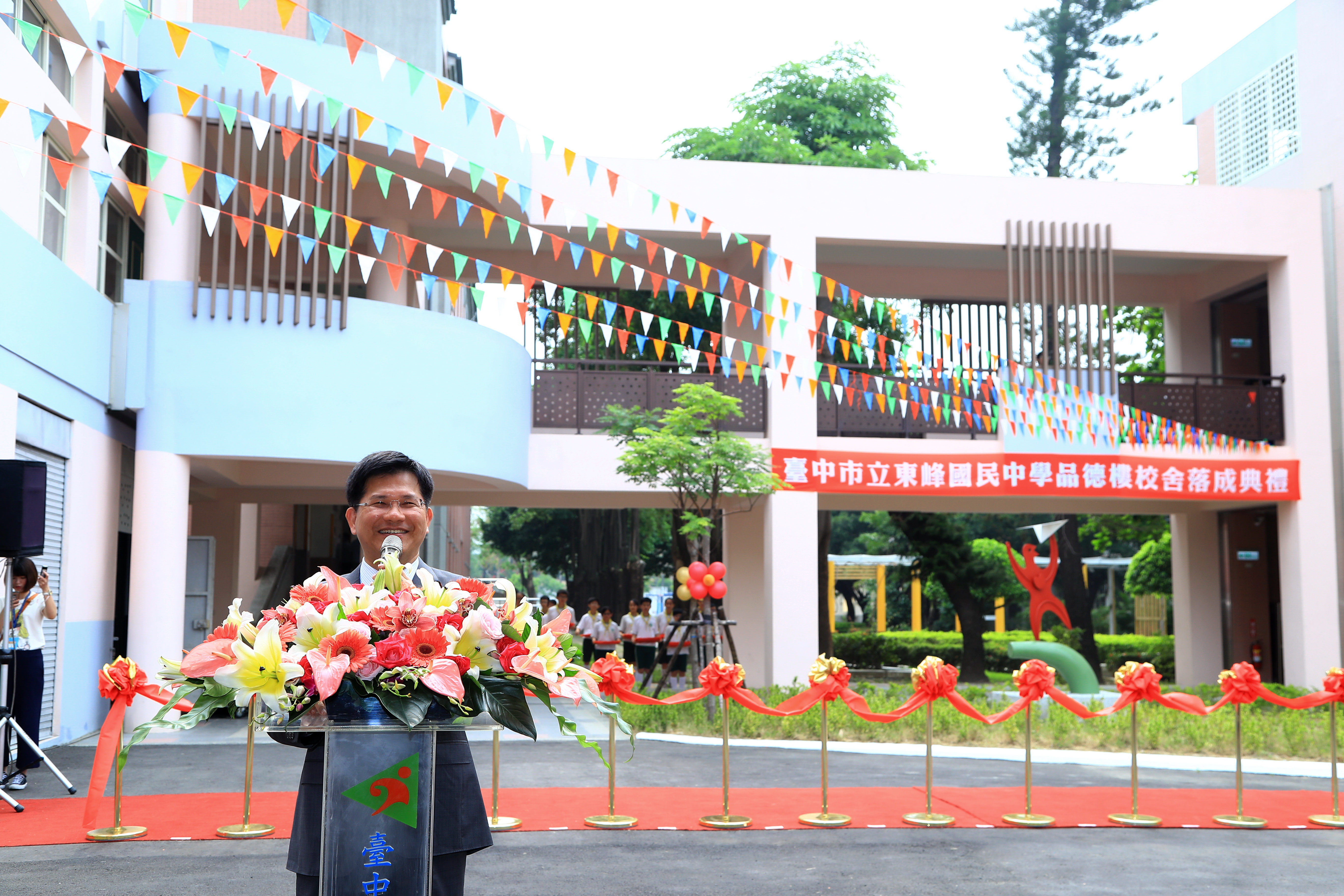 東峰國中新校舍落成典禮,包括林市長、教育局長彭富源、市議員邱素貞、鄭功進、李中、東區區長江惠雯、南區區長鍾正光,以及立委黃國書、盧秀燕等服務處代表、多位地方里長均出席,並為新校舍剪綵,氣氛熱鬧。