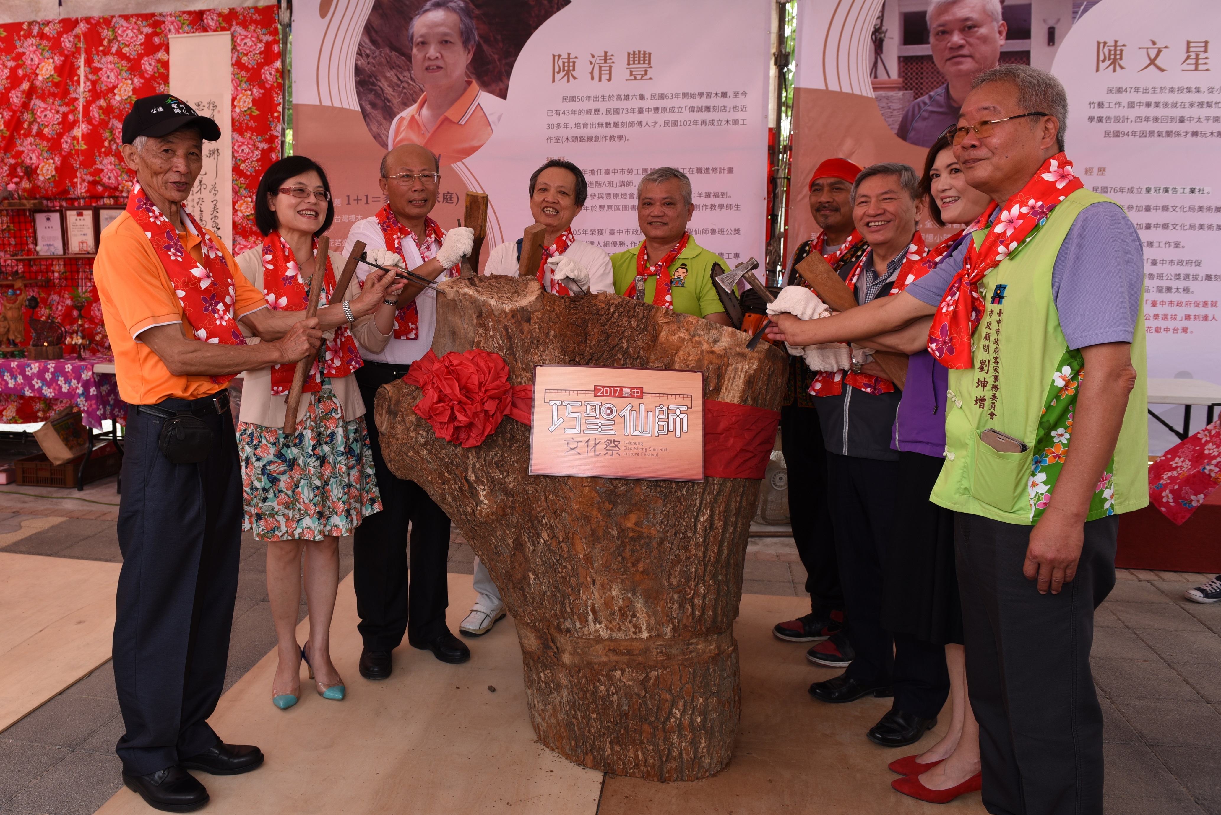 今日的儀式由副市長張光瑤主持,與勞工局長黃荷婷、客委會主委劉宏基、東勢區長徐佩鈴、東勢巧聖祖廟主委劉嘉富、市議員蘇慶雲、木雕大師陳清豐、陳文星及沙古流‧巴粗力等人一起,手持木雕工具在120公分,重達5噸的原木料上開斧啟雕。