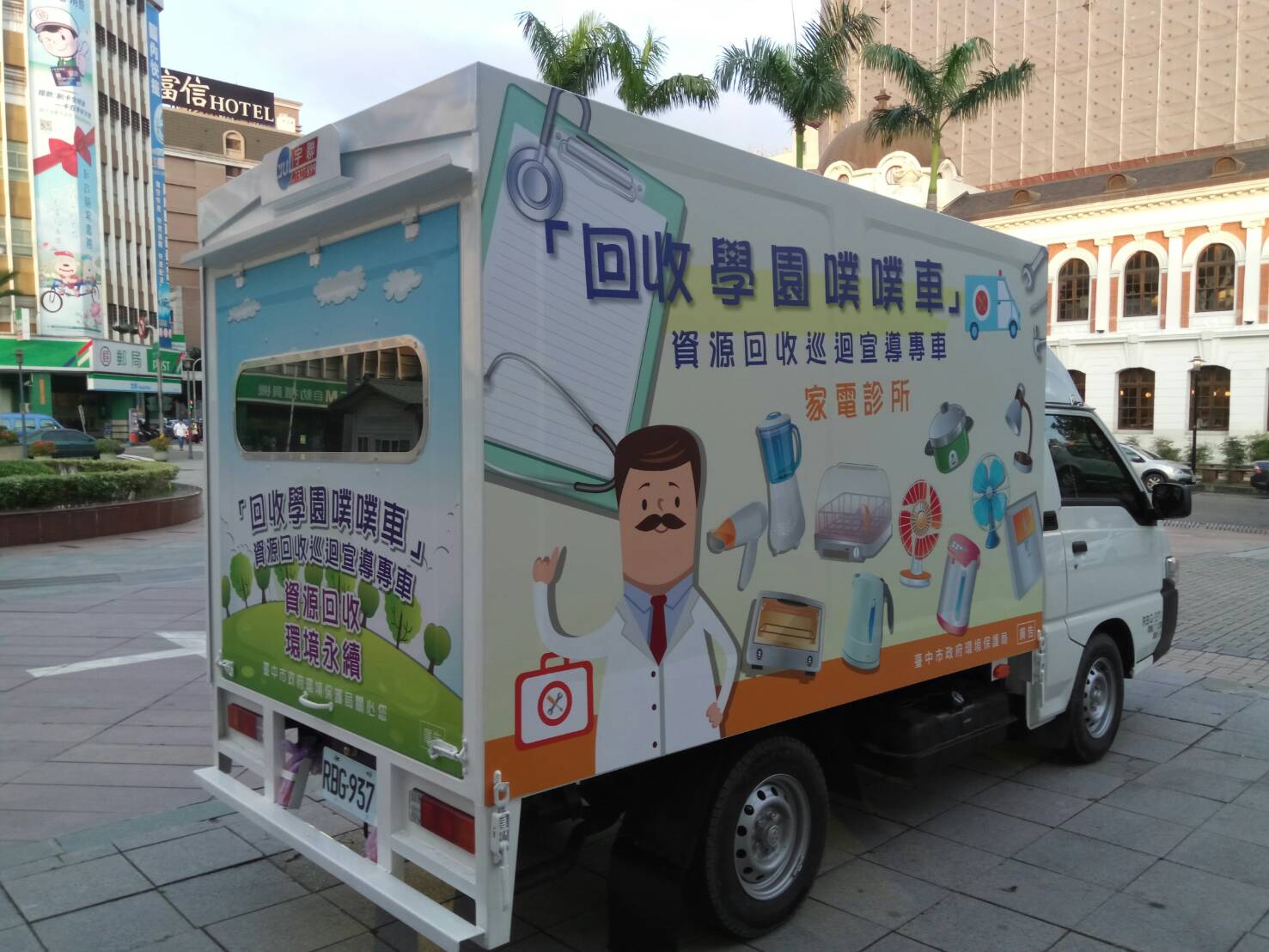 環保局表示,「回收學園噗噗車」裝置了跑馬燈、電視及音響等影音設備,機動性高且採隨到隨教的方式展開車箱,立刻就能進行資源回收宣導,車上並整合台中市首創的「二手物銀行」及「家電診所」。