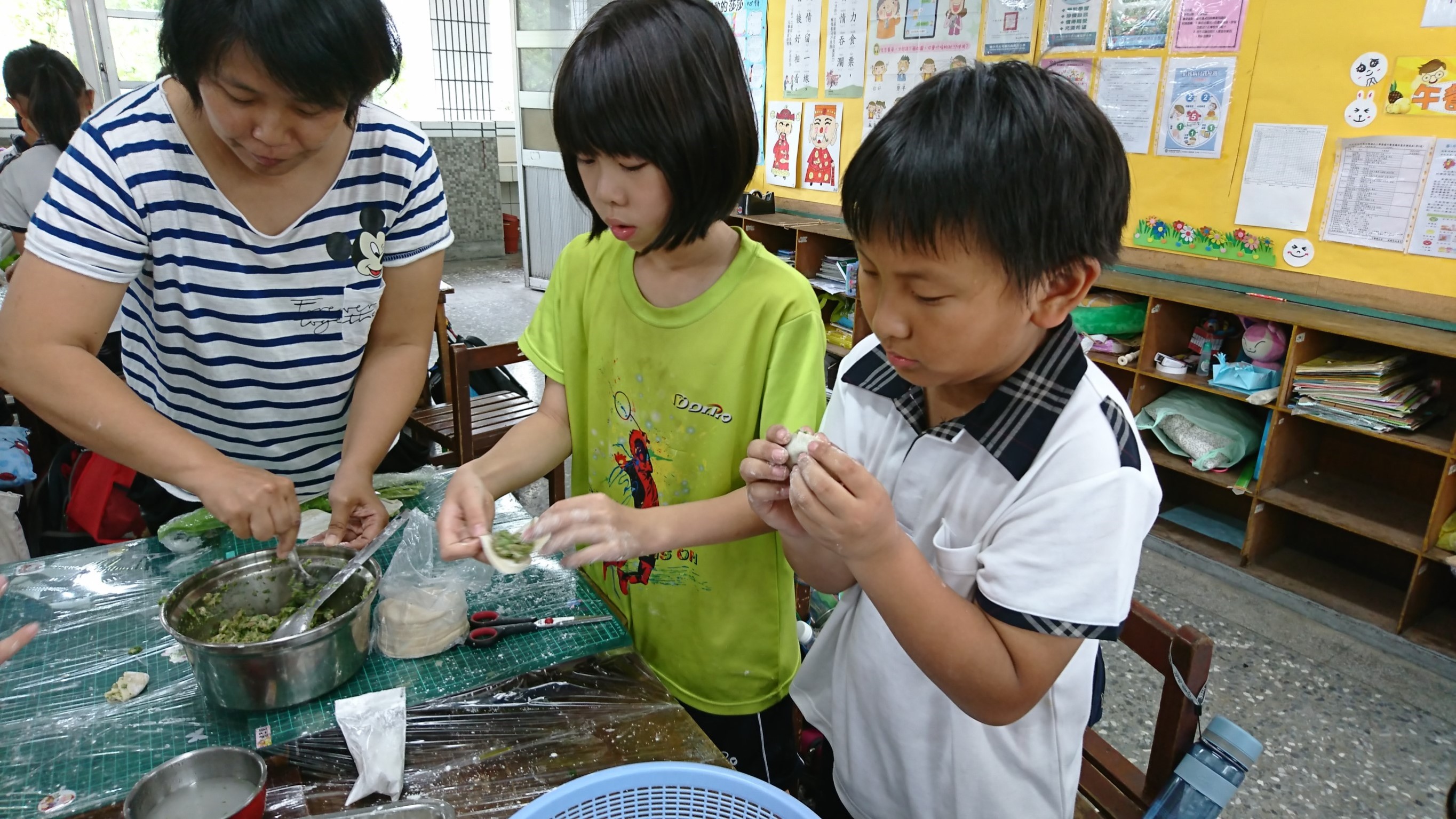 此外,學校使用的肥料是學校職工賴伯伯,利用午餐廚餘製作的有機酵素,每棵菜都長得青翠肥美;經由孩子們熱烈討論後,決定將收成的蔬菜包成水餃,並在午餐時間讓全校一起享用。