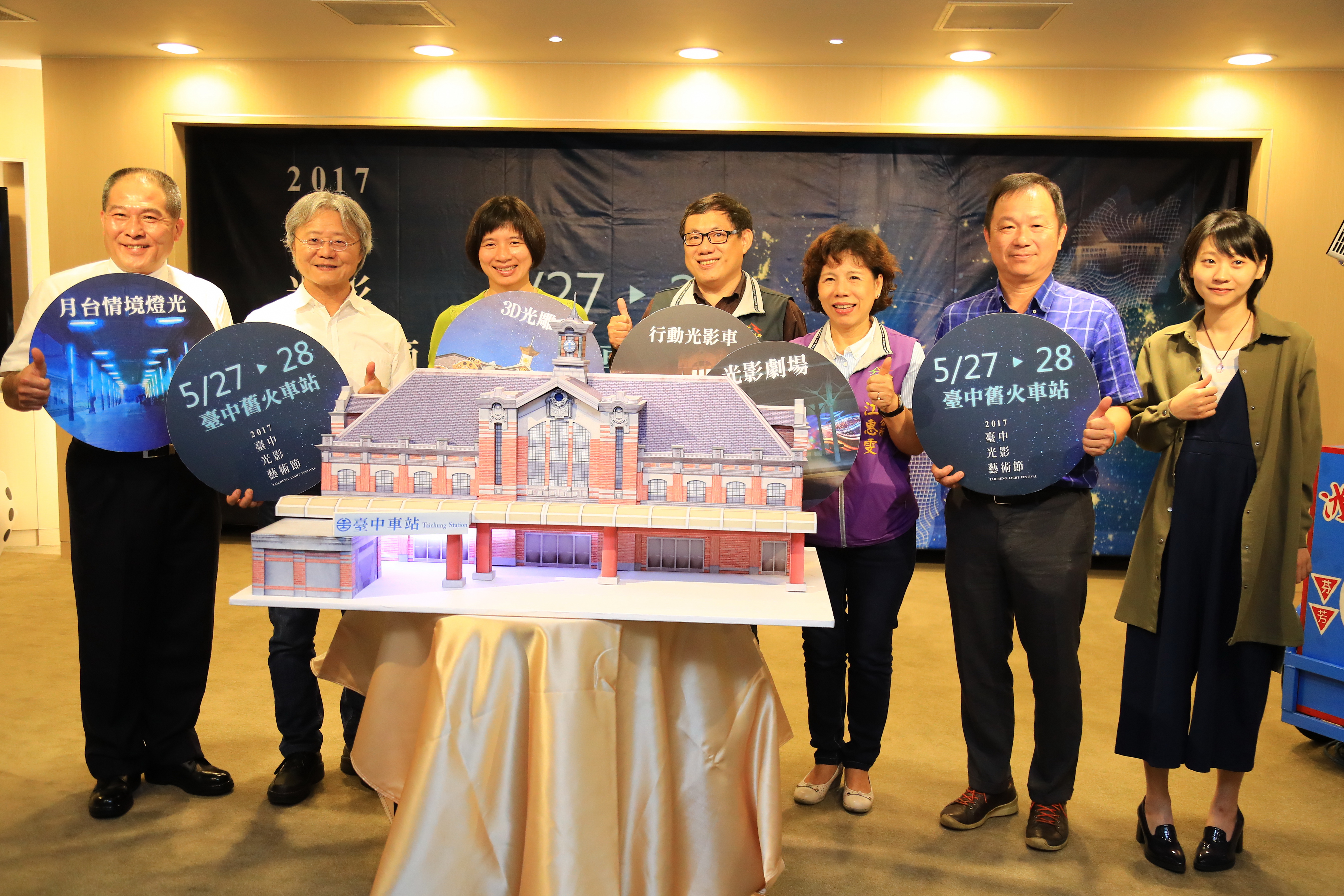2017台中光影藝術節記者會今(16)日在台灣大道市政大樓舉行,由火車站建築模型120秒的3D光雕秀開場,包括副市長林依瑩、市府文化局長王志誠、台中車站站長葉仁和、中區區長黃志民、東區區長江惠雯、台灣太陽餅博物館執行長陳瑛宗、台灣最美農村故事館長林佩萱等人都共襄盛舉,眾人也體驗行動光影車互動遊戲,氣氛熱鬧。