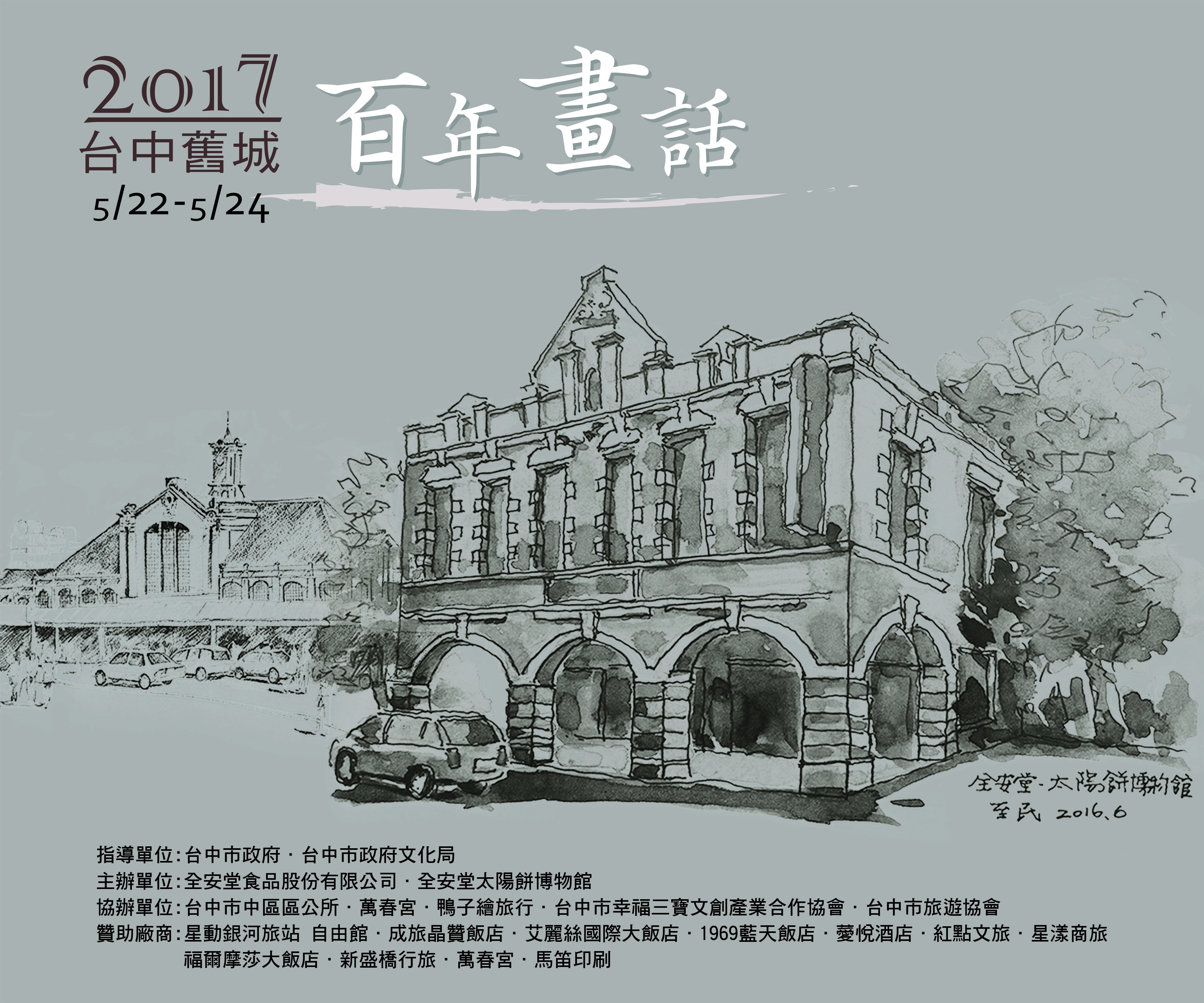 「2017台中舊城百年畫話」活動將於5月22日上午11時舉行開幕餐會,以30位藝術家手繪百年古厝全安堂開場;5月24日上午11時閉幕成果發表會,將展示30位藝術家3天來手繪中區的精彩成果。現場不但可與喜愛的藝術家交流,並安排在地熱心媽媽於全安堂旁巷內外燴古早味風味餐,以及著名老字號沁園春餐廳贊助包子名點,並配合端午佳節提供肉粽等美食,以自助百匯形式提供參加者享用。