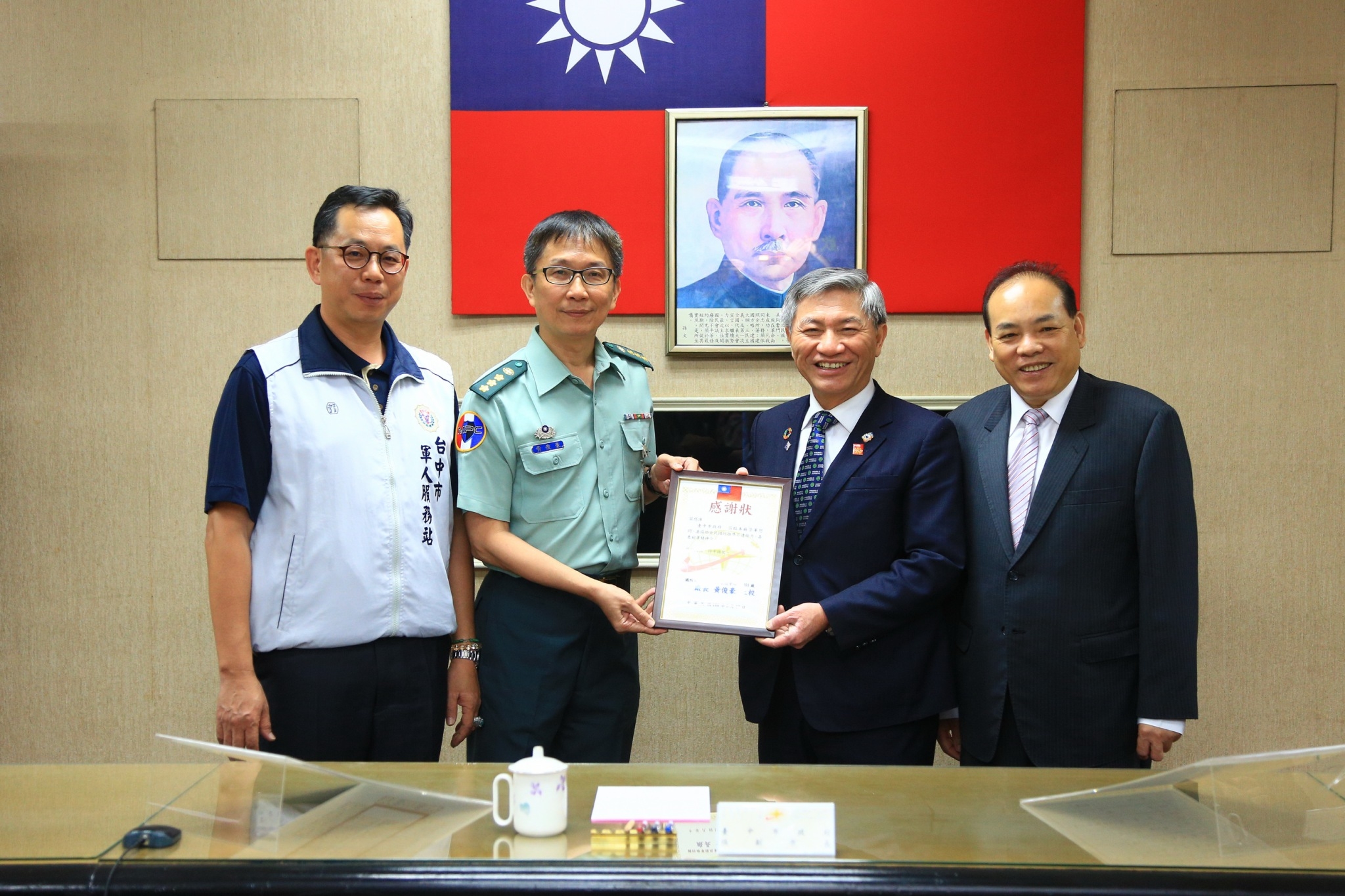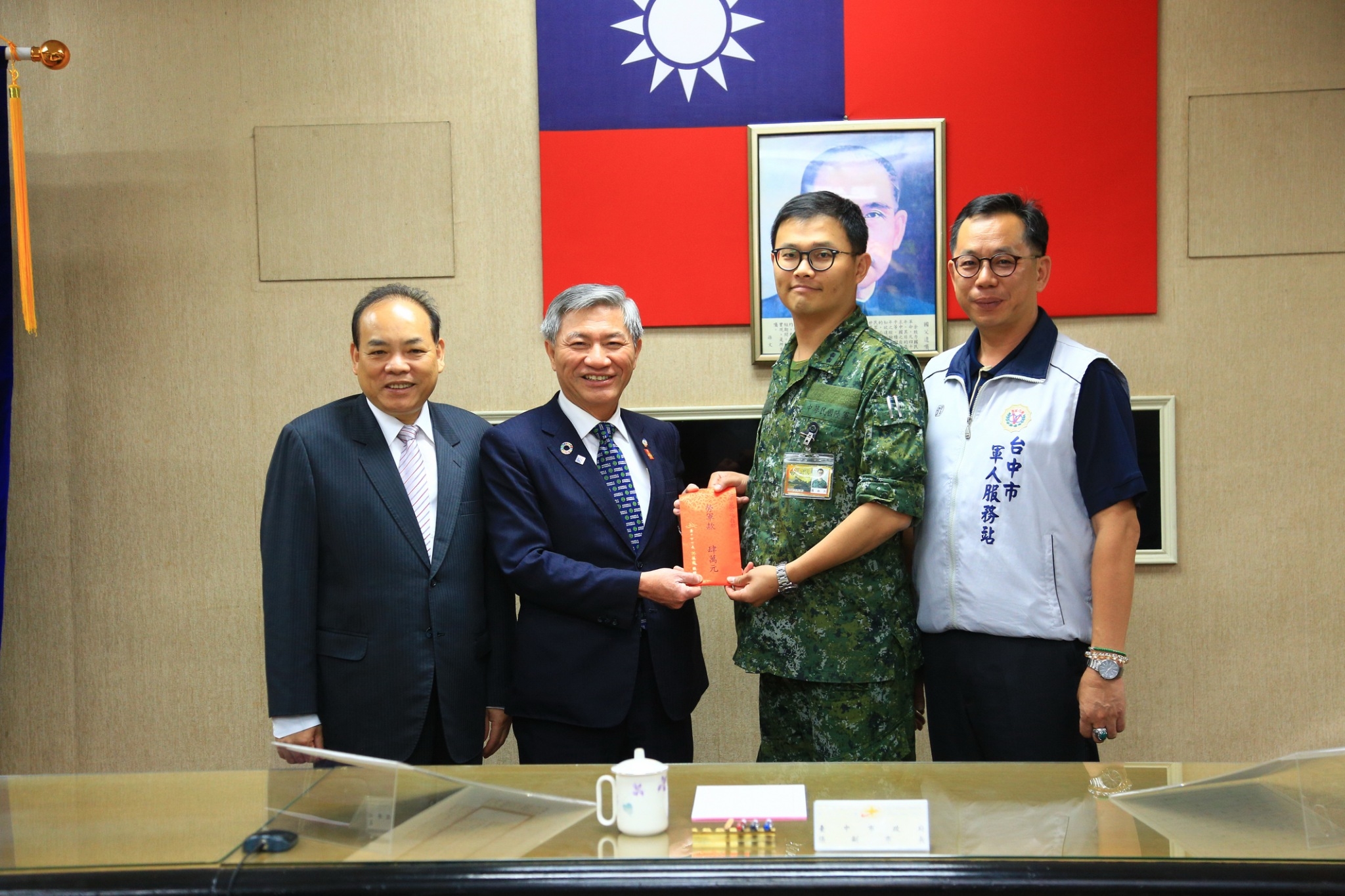 張副市長今天在民政局長蔡世寅的陪同下,前往東區經緯營區,由國防部軍備局生產製造中心第401廠廠長黃俊豪,代表國軍歡迎張副市長;張副市長致贈慰勞加菜金80萬元予第十軍團指揮部、海巡署中區巡防局、中區後備指揮部、台中憲兵隊等單位,並與各單位代表合影留念。
