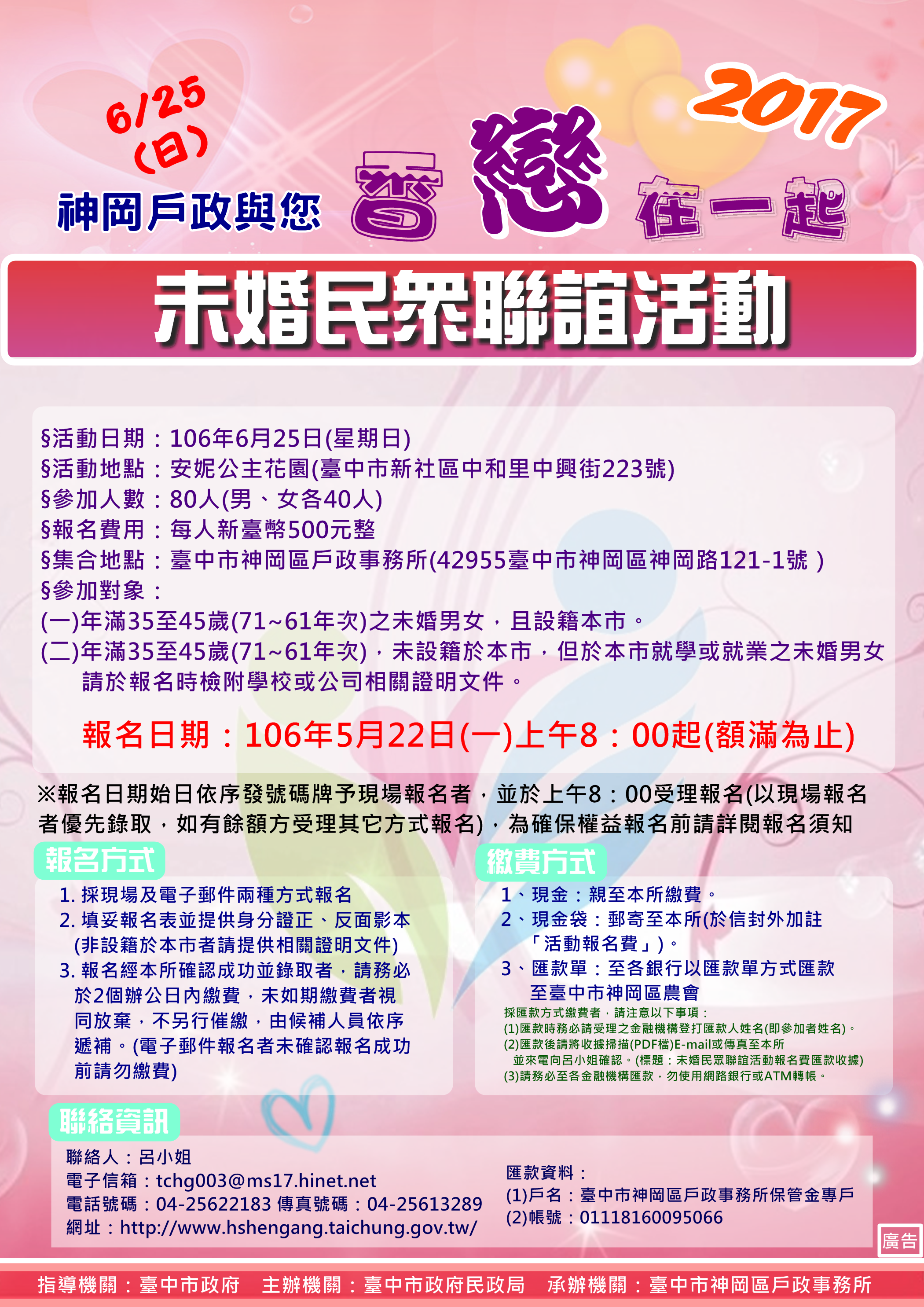 台中市政府今年度第7場次未婚民眾聯誼活動「2017香戀在一起」6月25日將於安妮公主花園舉行,5月22日上午8時起開始受理報名,歡迎設籍台中市或於台中市就學就業且年滿35歲至45歲的未婚男女,踴躍報名參加,男女各40人,額滿為止。