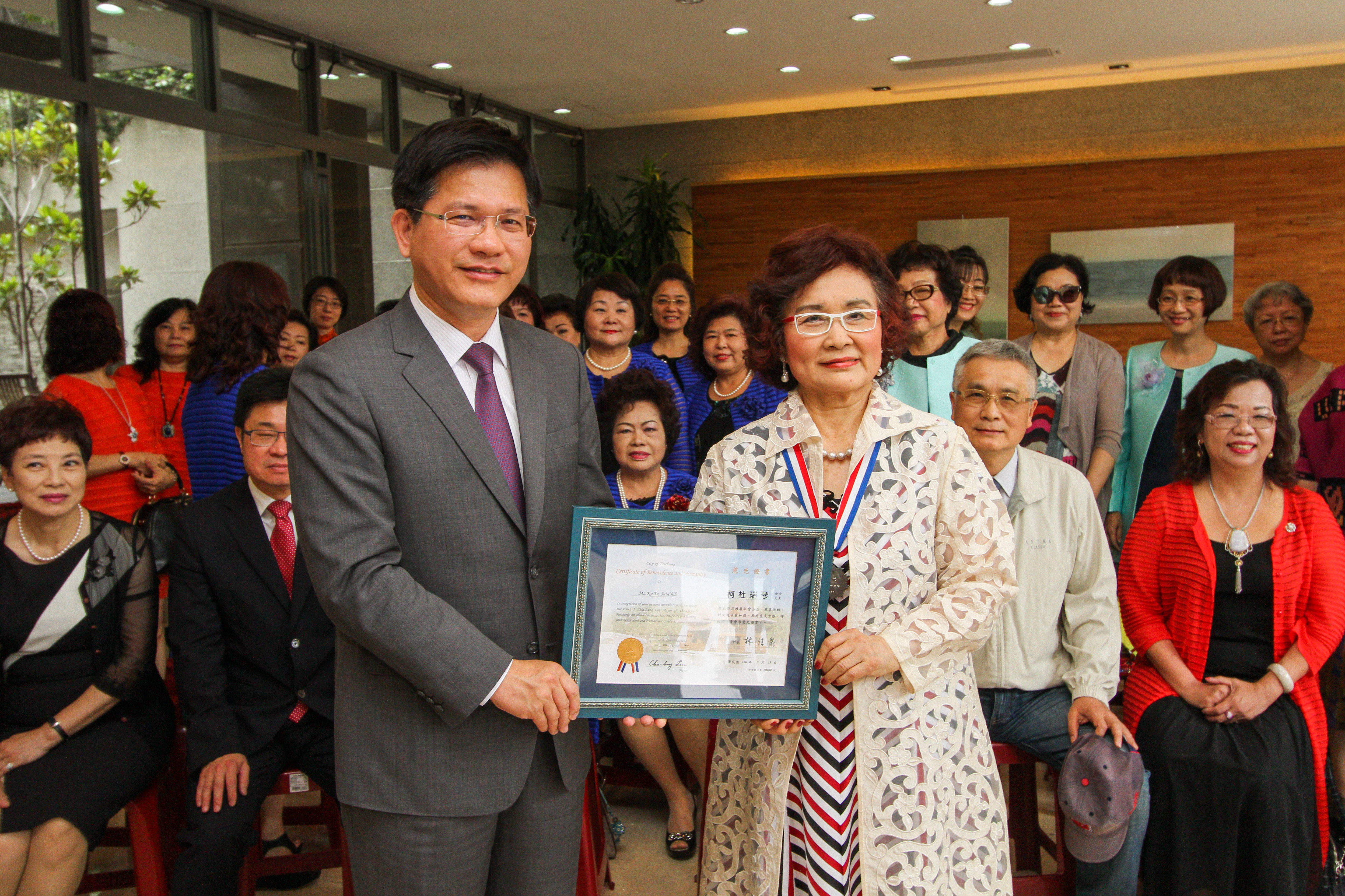 頒贈儀式今日在美村山脈會館舉行,由林市長頒贈慈光獎章及證書給柯杜董事長,包括市府社會局長呂建德、世界華人工商婦女企管協會總會代表及多位分會代表、前台中縣長廖永來、明台高中董事長林芳媖等人都共同見證,氣氛隆重溫馨。