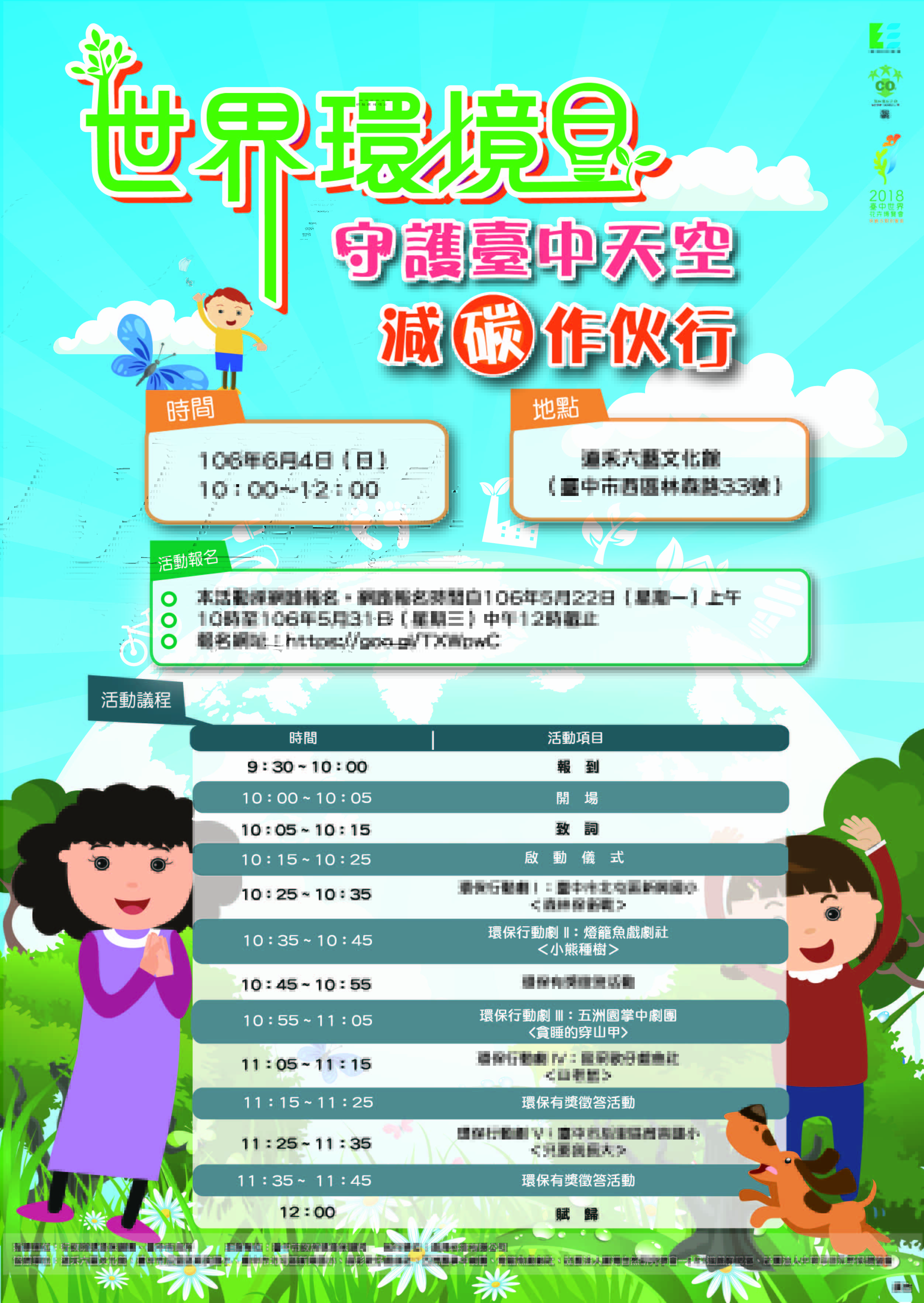 為響應世界環境日,台中市政府環保局將於6月4日上午10時在道禾六藝文化館舉辦「世界環境日-守護台中的天空,減碳作伙行」環境教育戶外劇場活動,邀請105年環保戲劇競賽台中市初賽優勝隊伍演出環境保護相關議題(如空汙及災害防救等),活動名額有限,網路報名時間自5月22日起至5月31日止,歡迎踴躍參加。