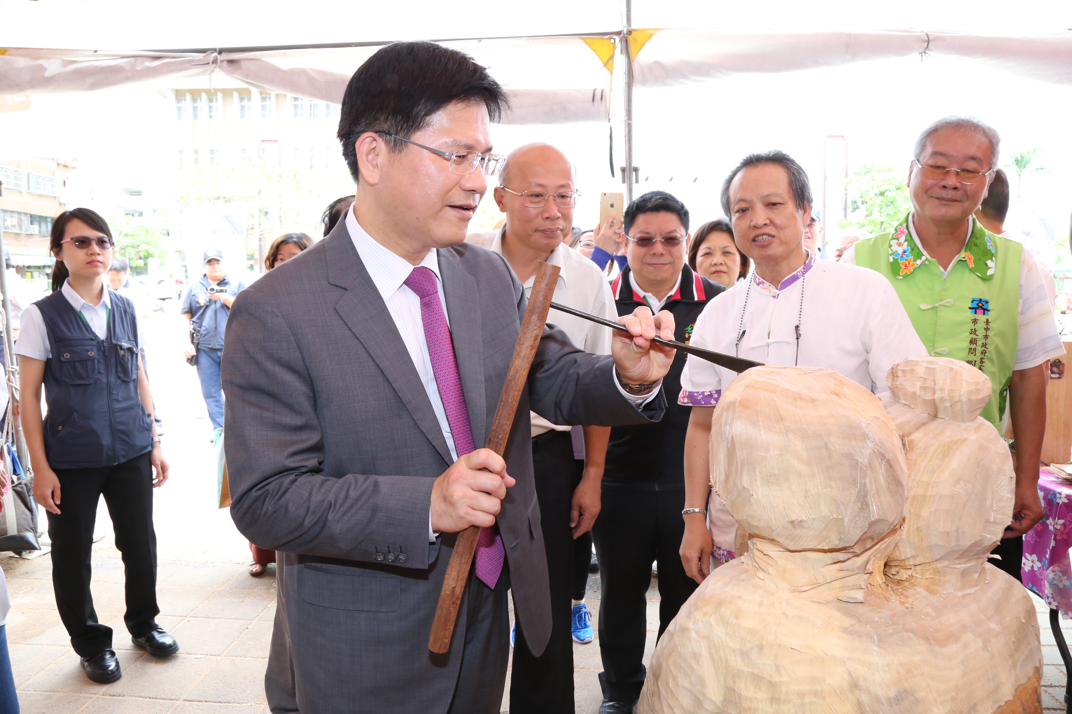 木雕大師陳清豐與陳文星分別致贈林市長創作作品「高跟鞋」及「領頭羊」,象徵步步高升,台中市在林市長帶領下越來越進步。