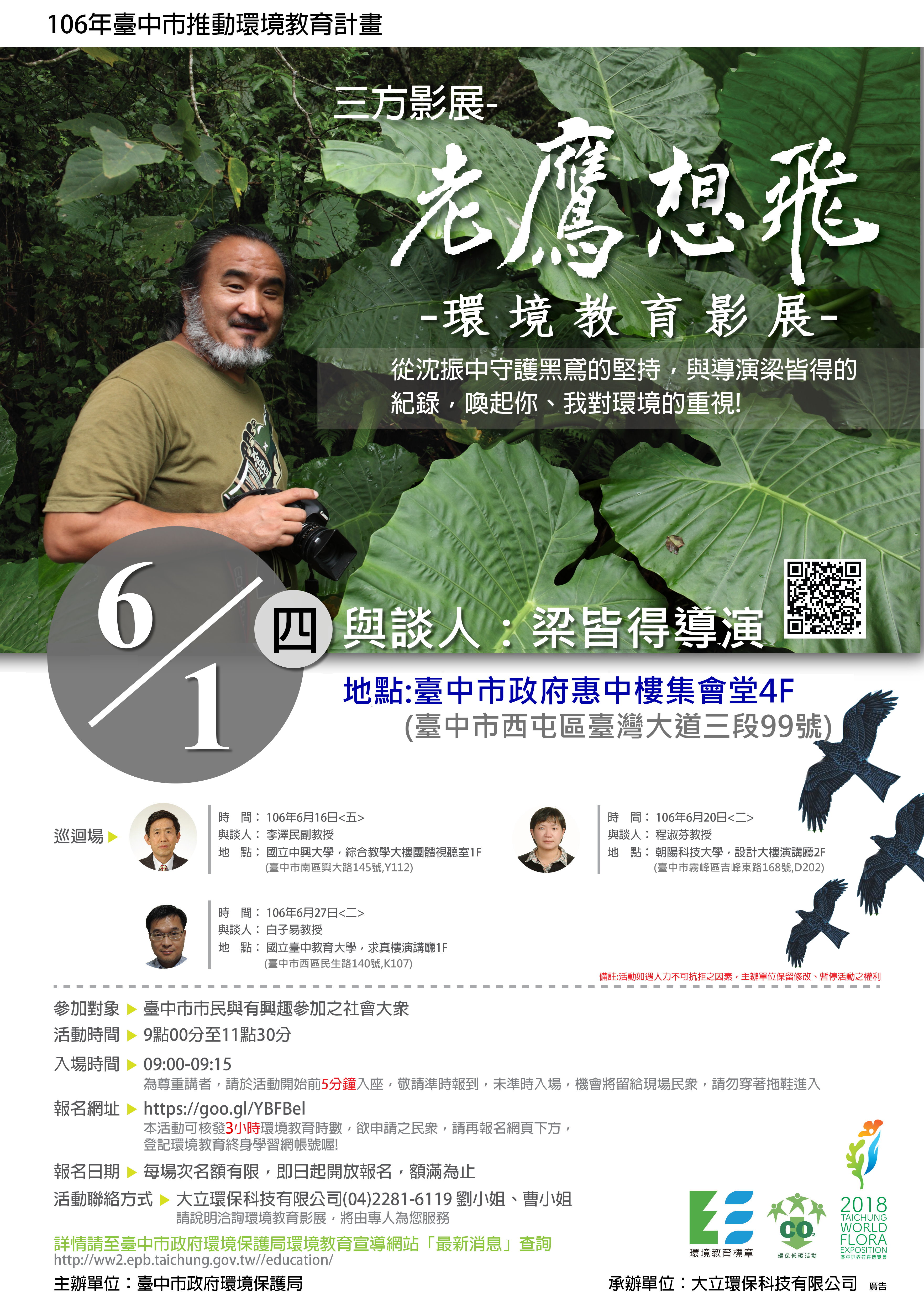 「老鷹想飛」環境教育影展將於6月期間舉辦四場次放映座談會,首場邀請梁皆得導演與市民面對面,探討影片傳達的理念,其餘每個場次也將安排環保領域專家進行映後交流,希望喚起更多人重視環境保育,瞭解生態面臨的困境。