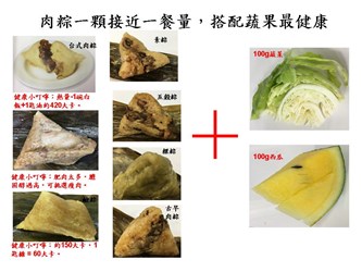 醬料中的含鈉量高,攝取過量易水腫及增加罹患高血壓風險,建議吃原味粽子較為健康,也可搭配富含豐富的水溶性及非水溶性膳食纖維或搭配竹荀湯、中部特有的蔴芛湯、消化酵素的瓜果類,如西瓜、鳳梨、木瓜等,可增加飽足感外,也能改善腸胃道環境,預防便秘;水果酵素可加速分解肉類蛋白質,預防胃脹氣。